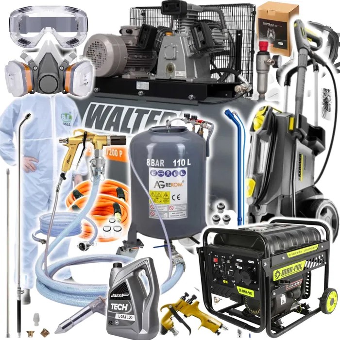 Na wyposażeniu również niezbędne maski, kombinezon, węże , olej do sprężarki .. Agregat dzięki temu że posiada na wyposażeniu 5 różnych lanc (pistoletów) ma bardzo szerokie zastosowanie ! Min. :