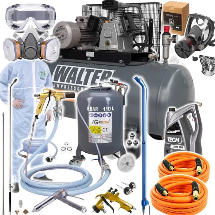 Na wyposażeniu również niezbędne maski, kombinezon, węże , olej do sprężarki .. Agregat dzięki temu że posiada na wyposażeniu 5 różnych lanc (pistoletów) ma bardzo szerokie zastosowanie ! Min. :