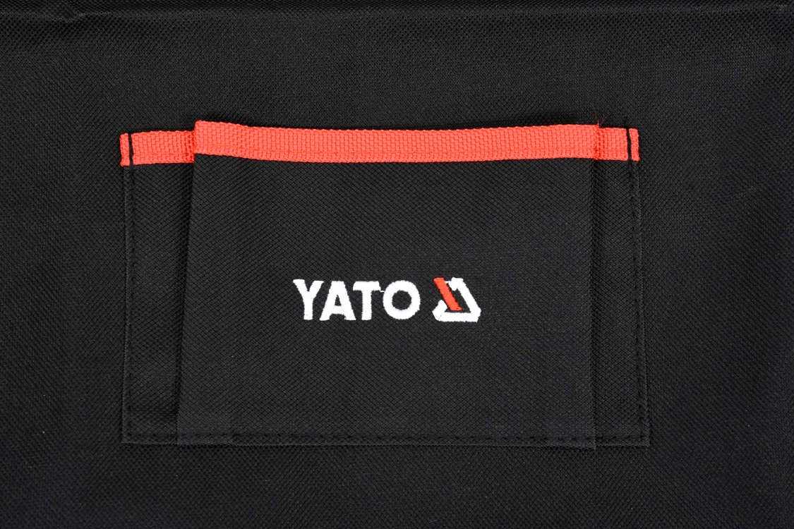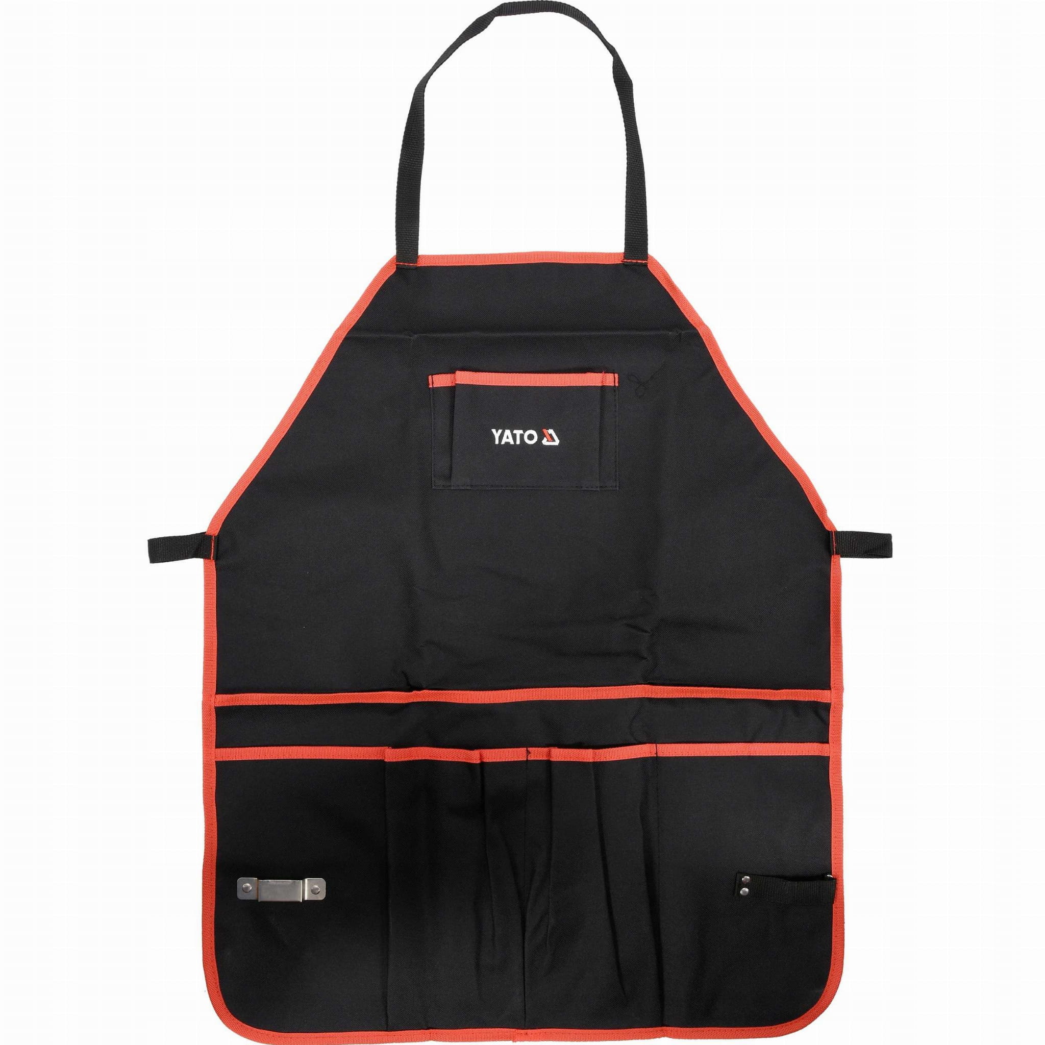Fartuch roboczy wodoodporny z sześcioma kieszeniami i uchwytami do mocowania młotka i miarki .