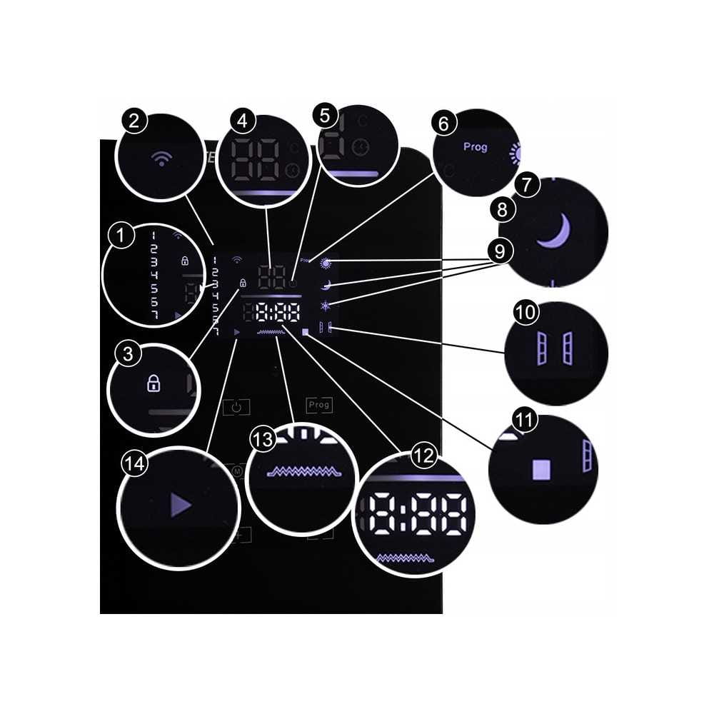 Sterowanie WiFi | Pilot | Panel LED | Timer | Technologia X-shape | Regulacja | Zabezpieczenia | IP24 | Kółka | Szklany front | Stojący lub montowany na ścianie | Termostat | Programator tygodniowy | Blokada rodzicielska | Tryb ECO | Wykrywanie otwartego okna | Anty-zamarzanie | 2 sposoby montażu - 2 tryby pracy - 3 programy pracy - 10-49°C zakres temperatur