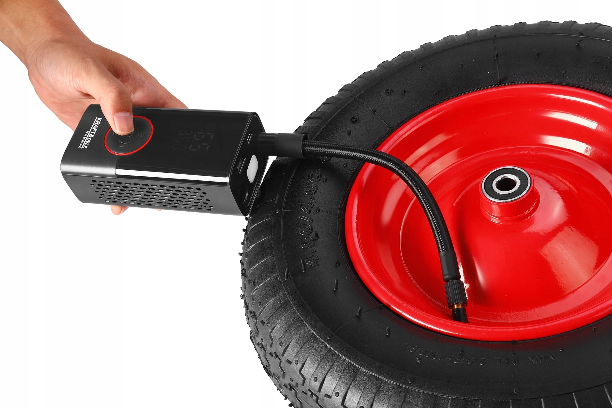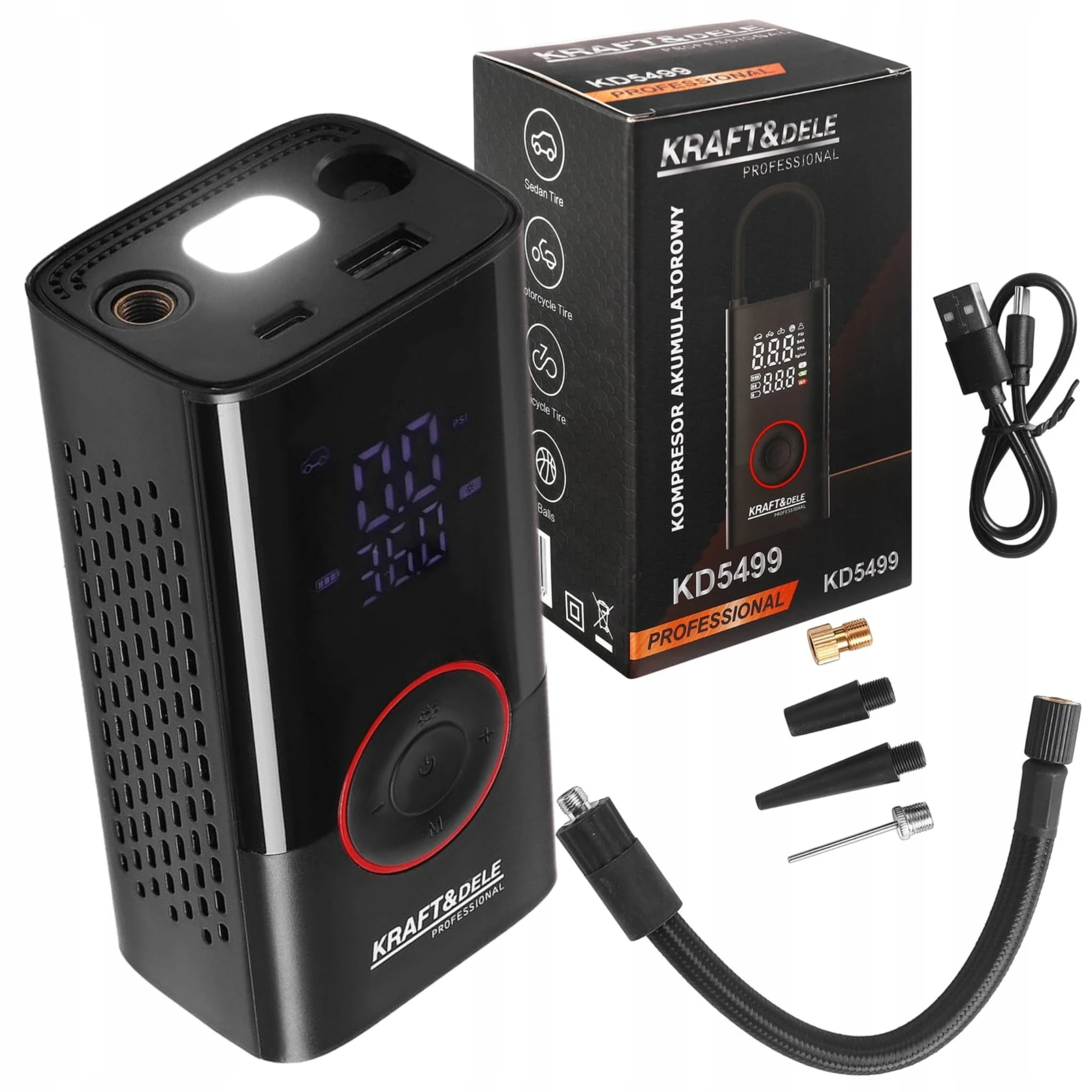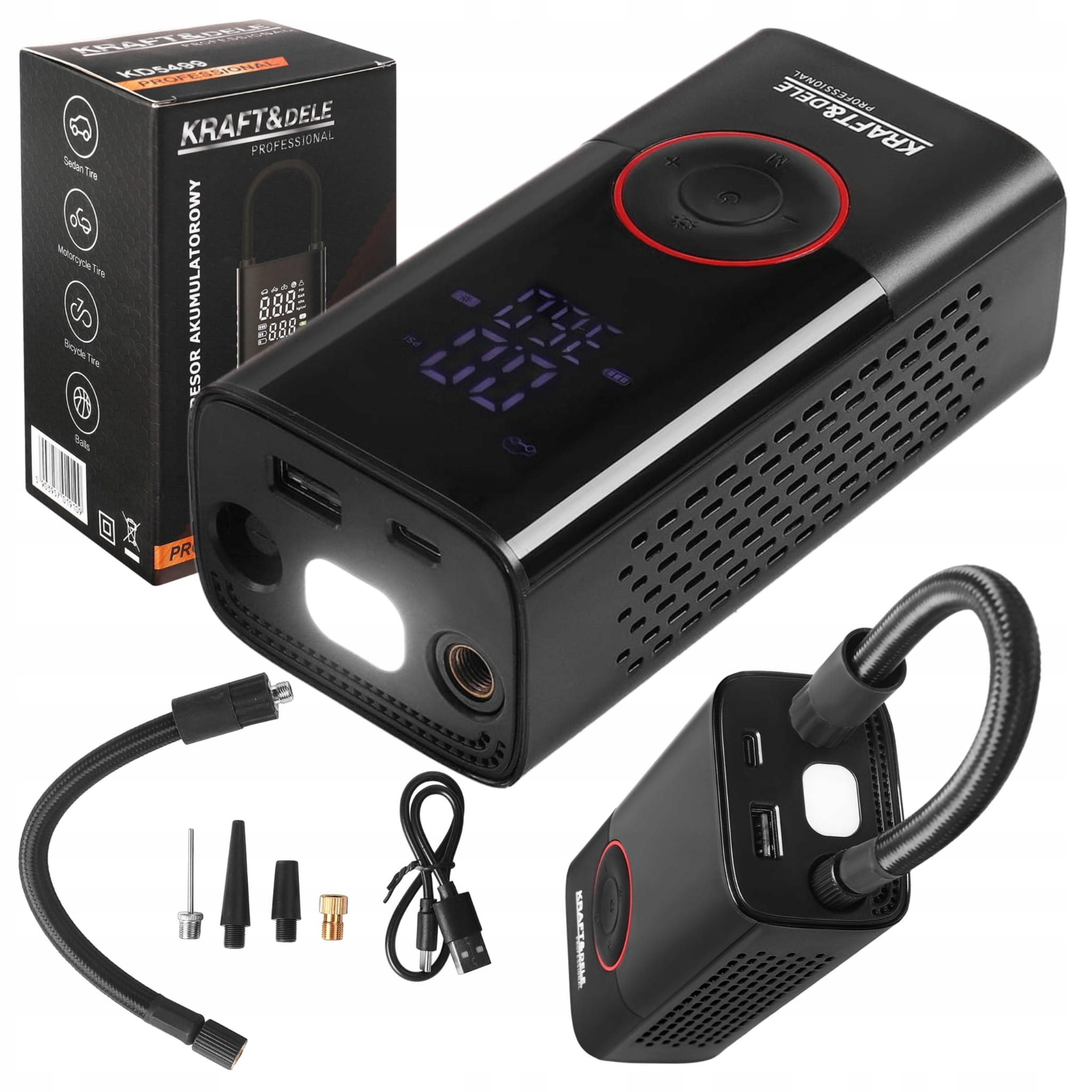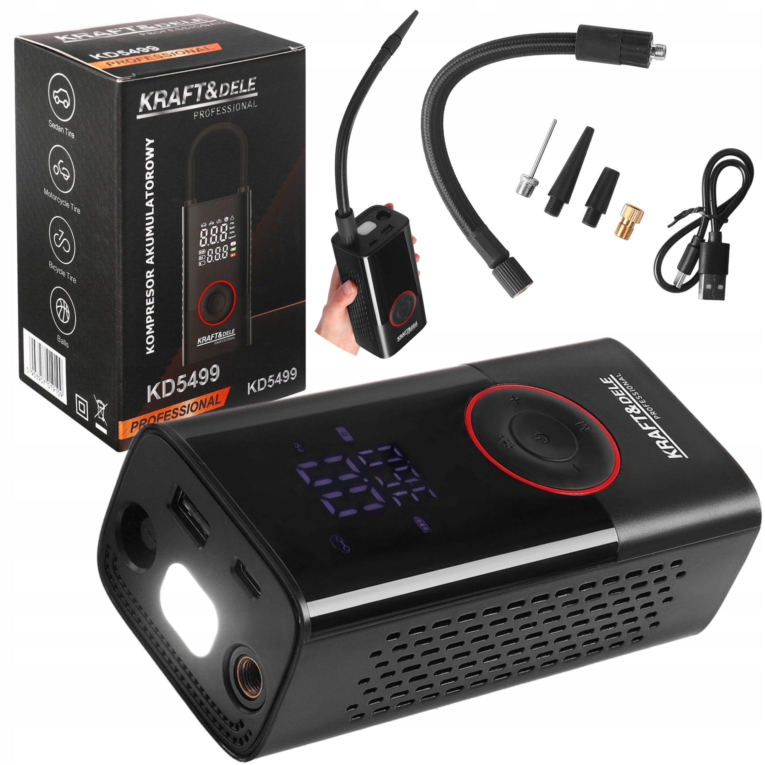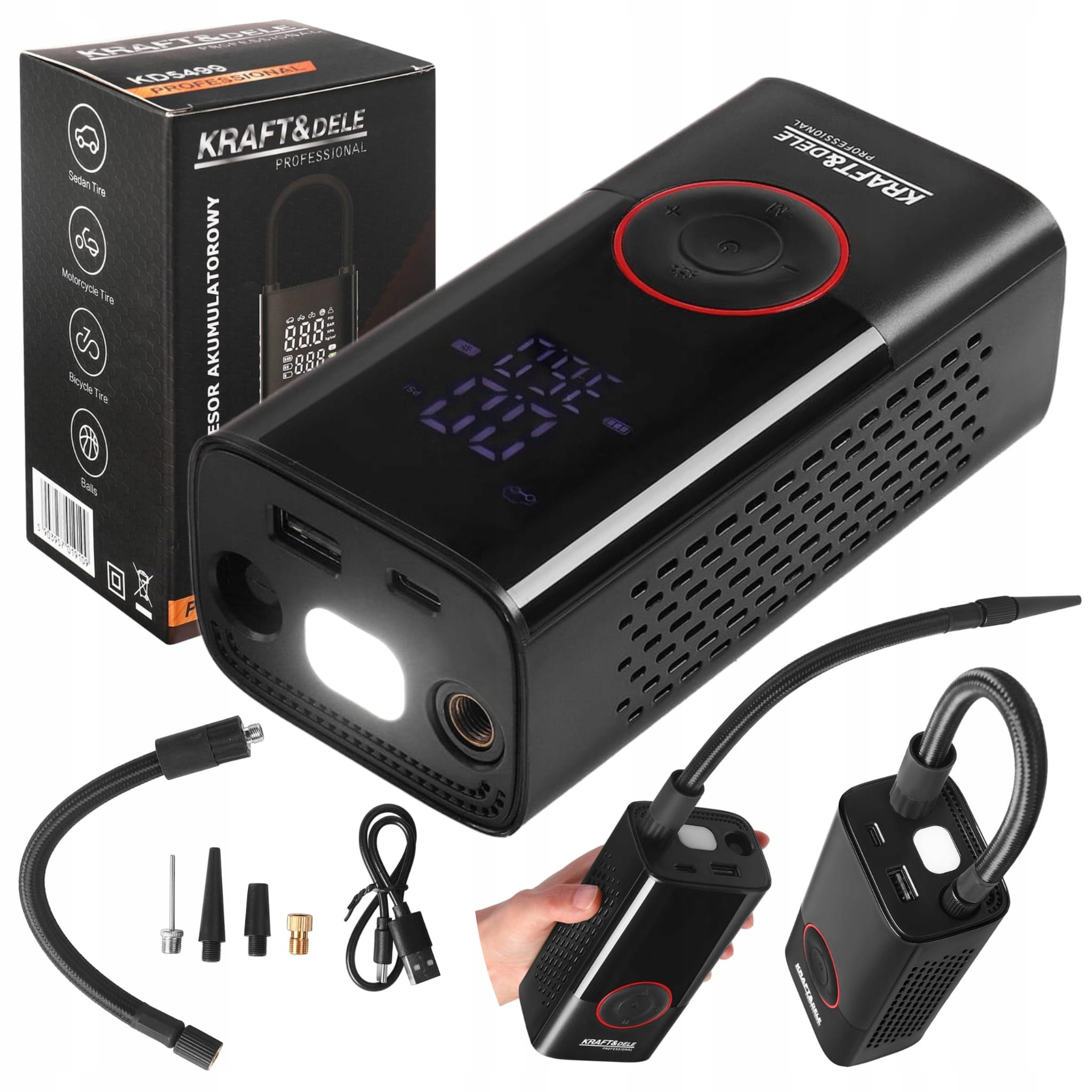 KD5499 to nowoczesny, przenośny kompresor akumulatorowy marki KRAFT&DELE, zaprojektowany z myślą o szybkim i wygodnym pompowaniu opon, piłek, materacy czy innych akcesoriów. Dzięki wbudowanemu akumulatorowi o łącznej pojemności 4000mAh oraz funkcji latarki LED, urządzenie doskonale sprawdzi się zarówno w warsztacie, jak i podczas podróży.