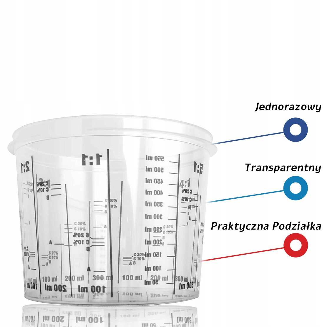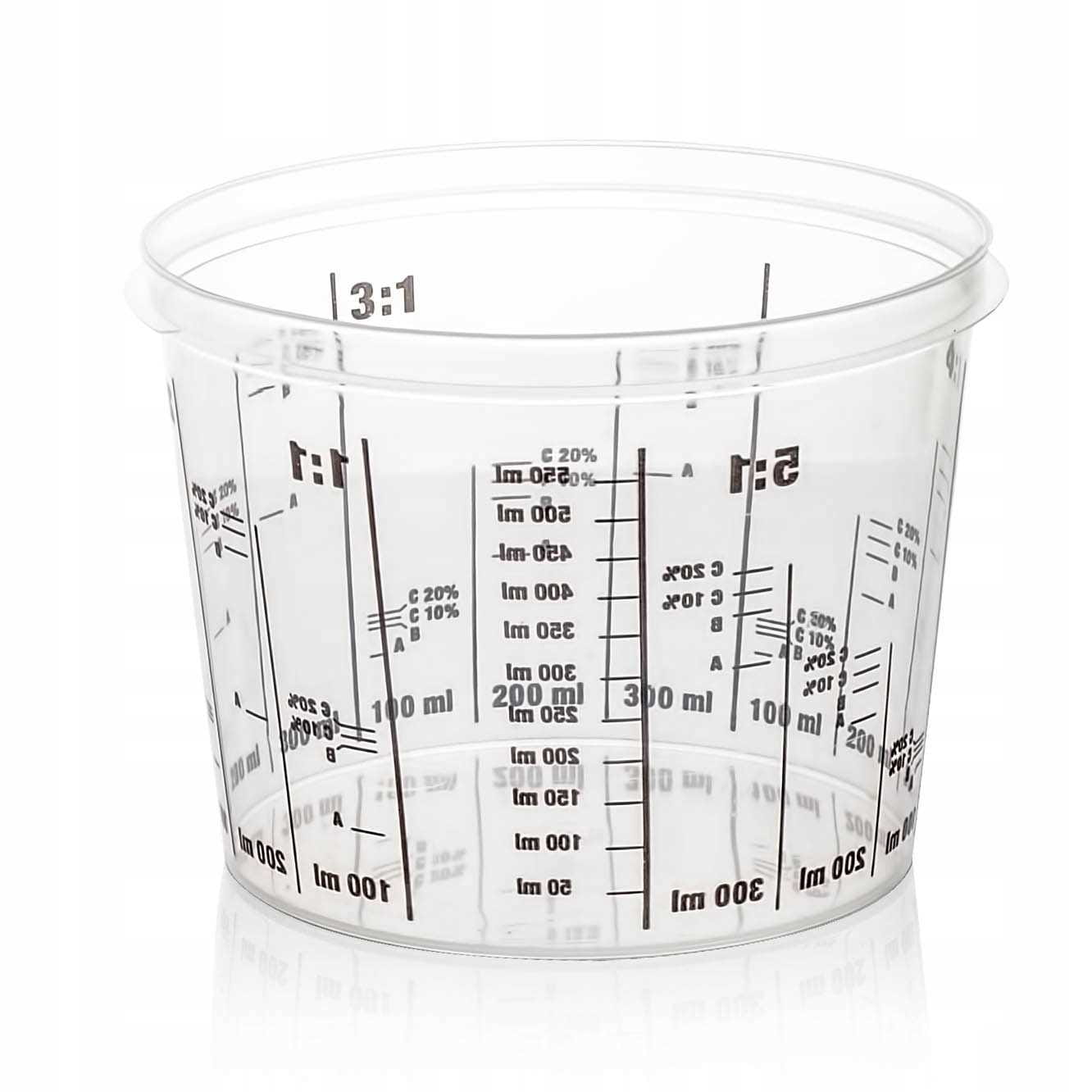 Transparentny pojemnik z nadrukowaną podziałką pozwalający na dokładne wymieszanie i odmierzenie materiału. Wykonany z elastycznego tworzywa co ułatwia rozlewania cieczy. Kubek posiada właściwości antystatyczne i jest wolny od zanieczyszczeń.