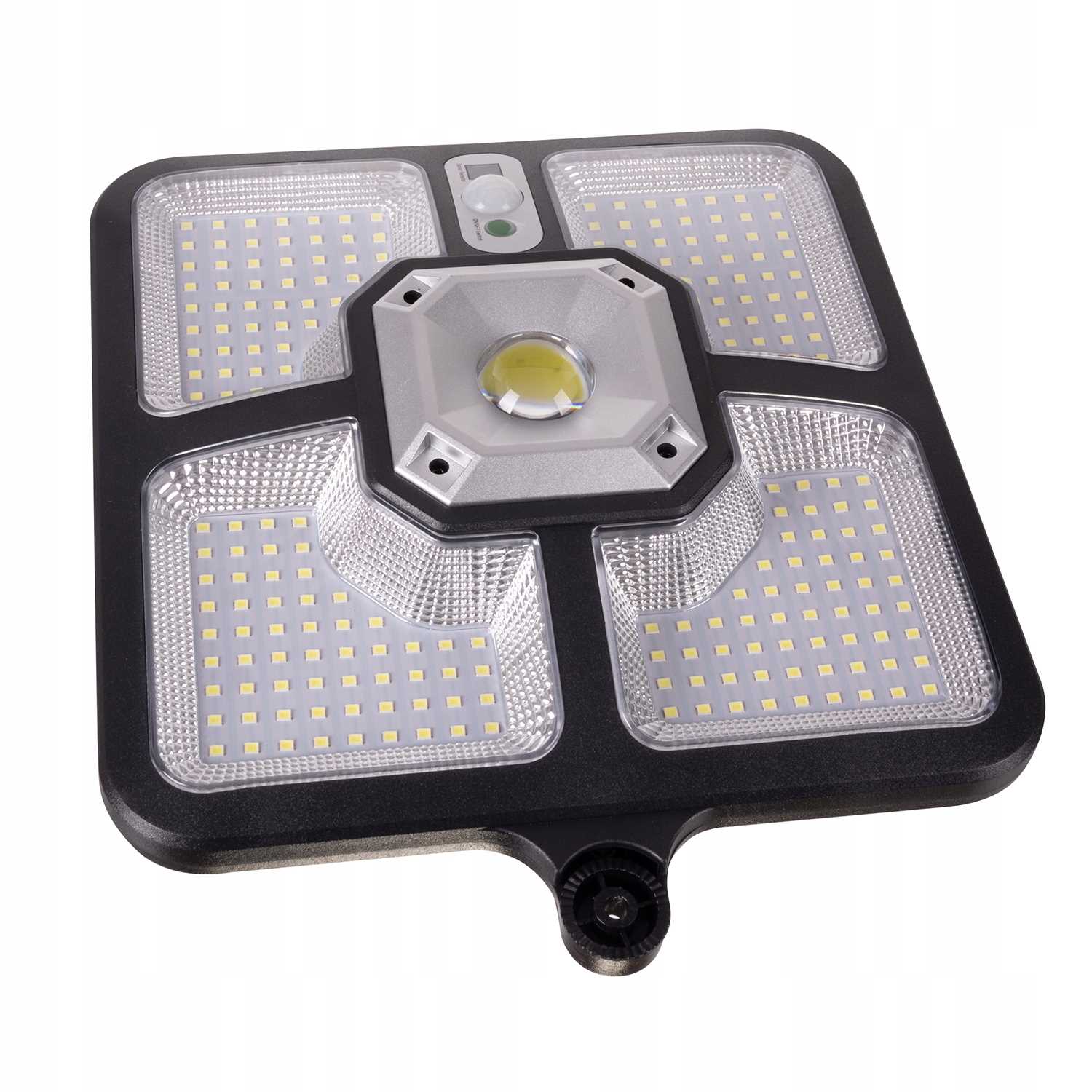 - SPECYFIKACJA: kolor: czarny; barwa światła: zimny biały; materiał: ABS + tworzywo sztuczne; lampa zbudowana: z 4 segmentów po 55 diod SMD razem 220 diod; soczewka z 15 COB; wodoodporność: IP65; zasięg czujki ruchu: 5 m; akumulator: 2 x 1200mah; czas pracy: wiosna lato: 6-8 h; zima: 8-10 h; napięcie: 5,5V; moc: 8W; kąt świecenia: 120 °; wymiary: 36,5 x 23 x 4,5 cm; waga: 0,633 kg; waga w opakowaniu: 0,813 kg.