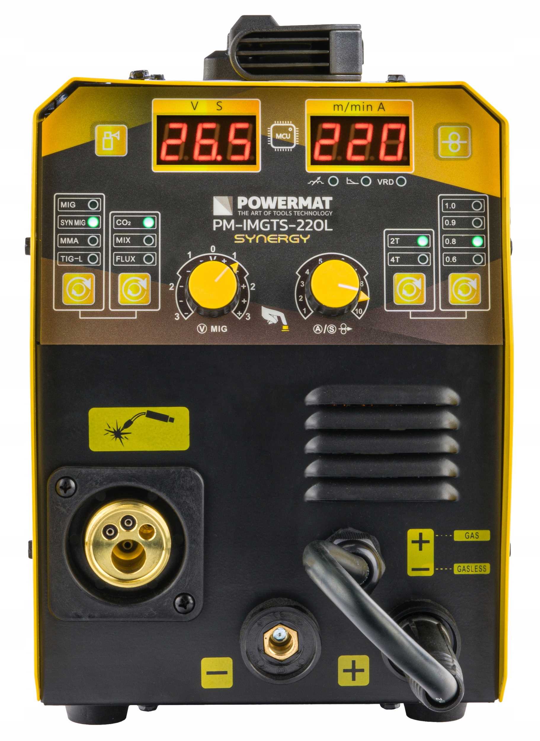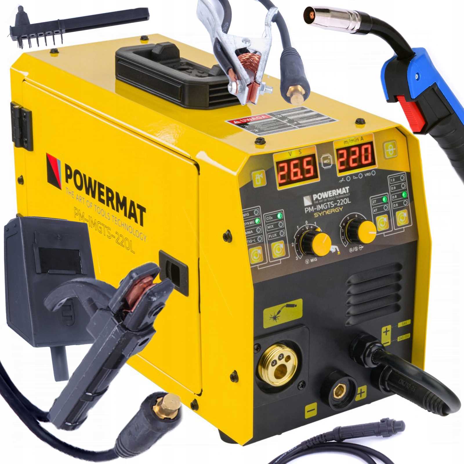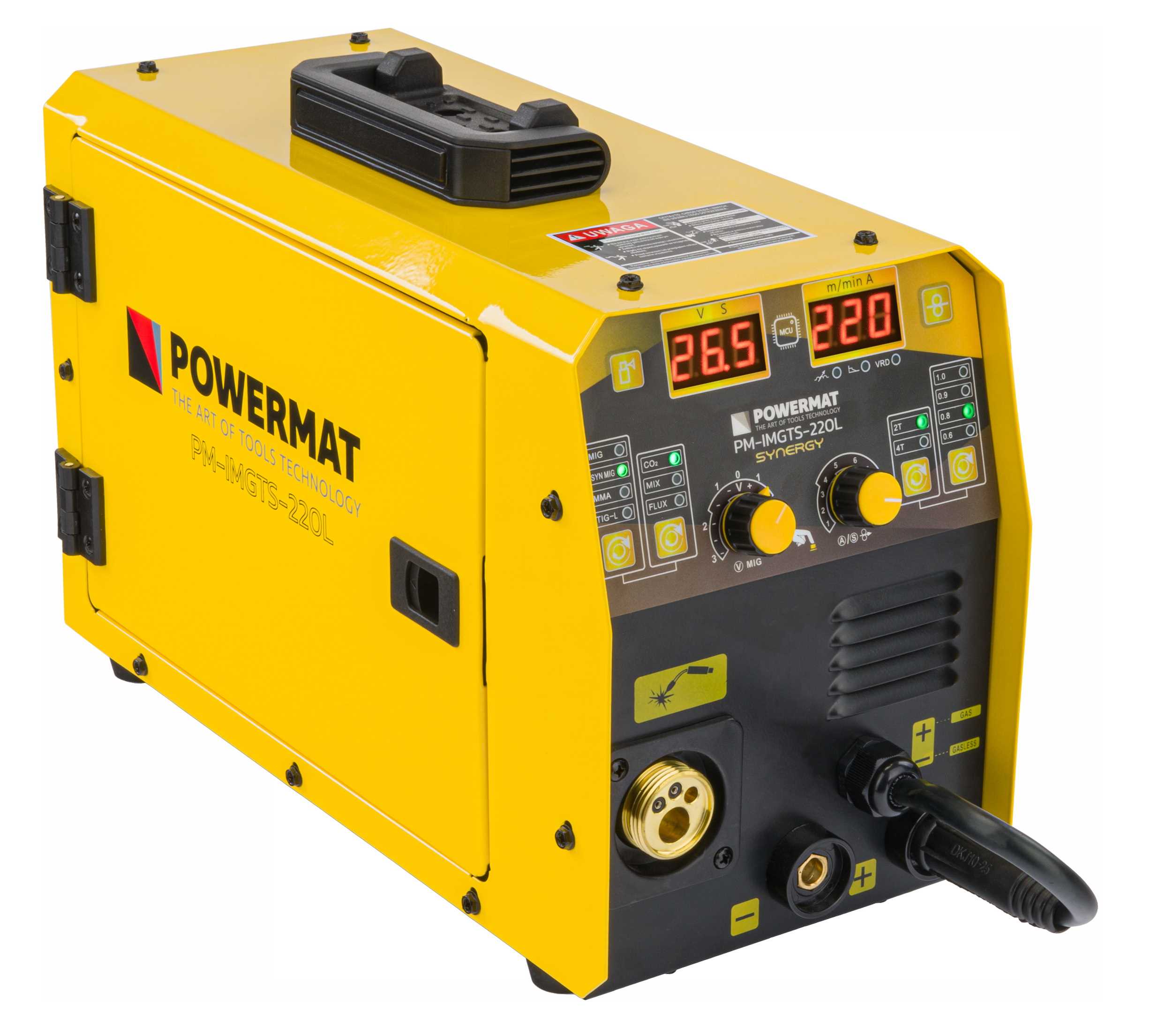 Model PM-IMGTS-220L jest automatem spawalniczym, którego konstrukcja bazuje na wydajnych tranzystorach IGBT. Wyposażony jest w 2 czytelne wyświetlacze LCD wskazujący aktualny prąd spawania ustawiany pokrętłami, przy czym jeden z nich jest również przyciskiem wyboru funkcji. Migomat wyposażony jest w wentylator chłodzący, układy elektroniczne oraz pozostałe komponenty, a także czujnik termiczny zabezpieczający urządzenie przed przegrzaniem