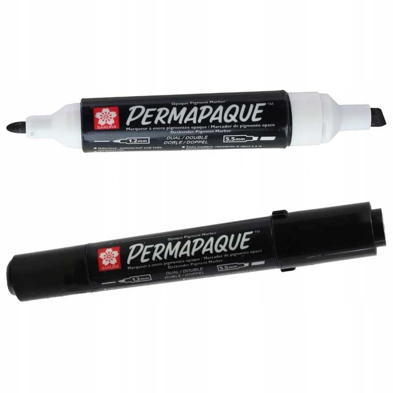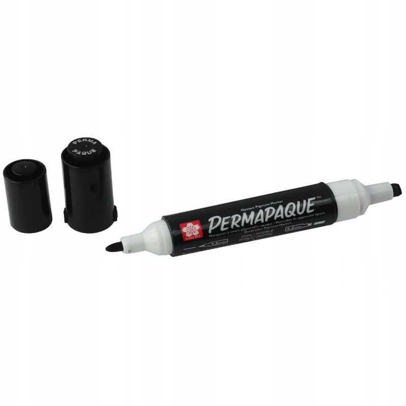 Sakura Permapaque to wyjątkowy, uniwersalny marker permanentny z atramentem pigmentowym na bazie wody. Marker ma dwie końcówki: cienką 1,2 mm i szeroką 5,5 mm, i nie wymaga wstrząsania ani pompowania przed użyciem.