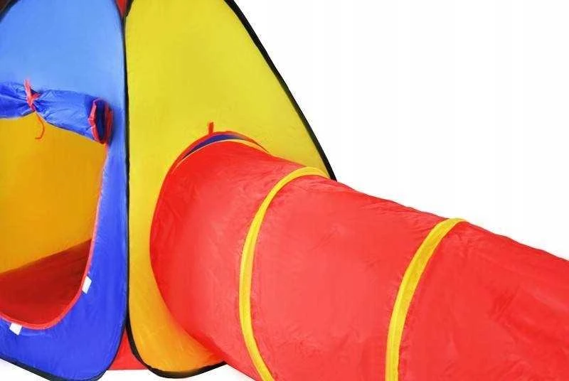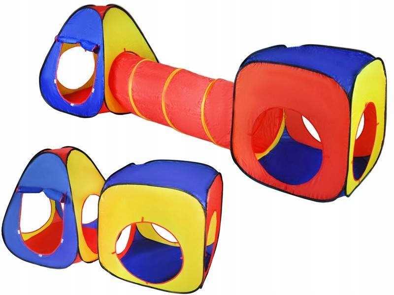 Namiot dla dzieci to nie tylko miejsce do zabawy, ale także przedmiot intensywnie rozwijający ich wyobraźnię, dający poczucie bezpieczeństwa i wzmagający aktywność fizyczną, zarówno w domu, jak i na dworze. Rozkładany domek materiałowy to super zabawa dla najmłodszych! Dwa namioty połączone ze sobą elastycznym tunelem zagwarantują świetną zabawę dla każdego małego odkrywcy. Namiot stożkowy otwierany jest z przodu i połączony tunelem z namiotem w kształcie kostki z 3 osobnymi wyjściami. Dzięki temu, posiadając kilka zestawów, można dowolnie konfigurować elementy i stworzyć niesamowity labirynt.