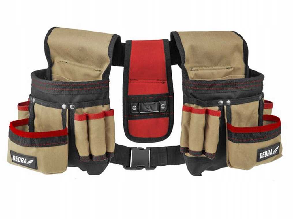 Pas narzędziowy 3-częściowy N0033 niezwykle przydatny podczas prac budowlanych, wykończeniowych, monterskich oraz majsterkowania. Umożliwia trzymanie w zasięgu ręki, wszystkich potrzebnych narzędzi i materiałów do pracy. A miejsca jest naprawdę dużo, bo pas ma 16 kieszeni, 2 przegrody, obszerną zewnętrzną kieszeń na gwoździe, wkręty lub inne drobne elementy, a także pętle na młotek i osobny pokrowiec na taśmy miernicze. Pas DEDRA wykonano z trwałego poliestru 600D. Dodatkowo, miejsca szczególnie narażone na rozdarcia i uszkodzenia są wzmocnione stalowymi nitami. Dla większego komfortu użytkowania jest możliwość dostosowania długości do paska.