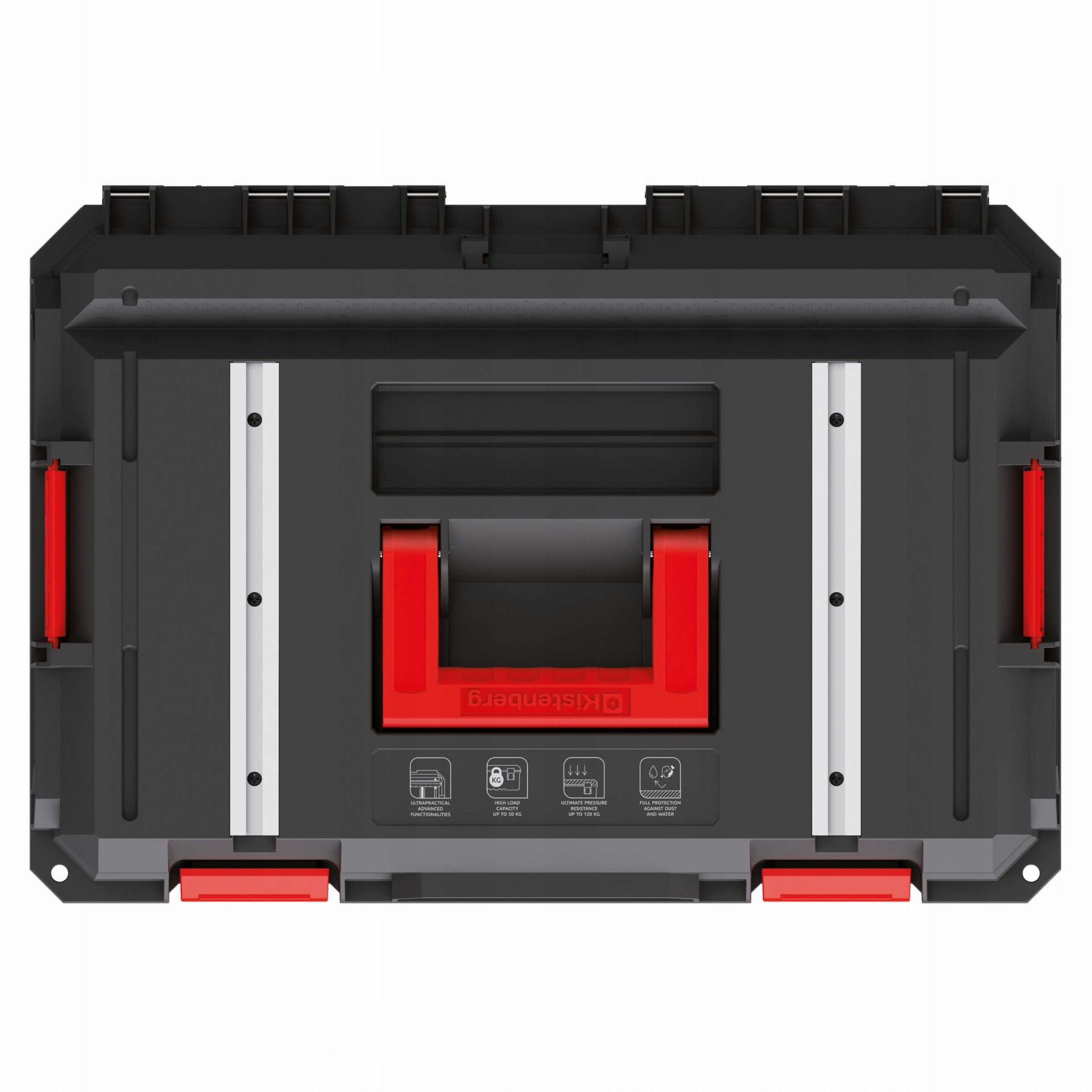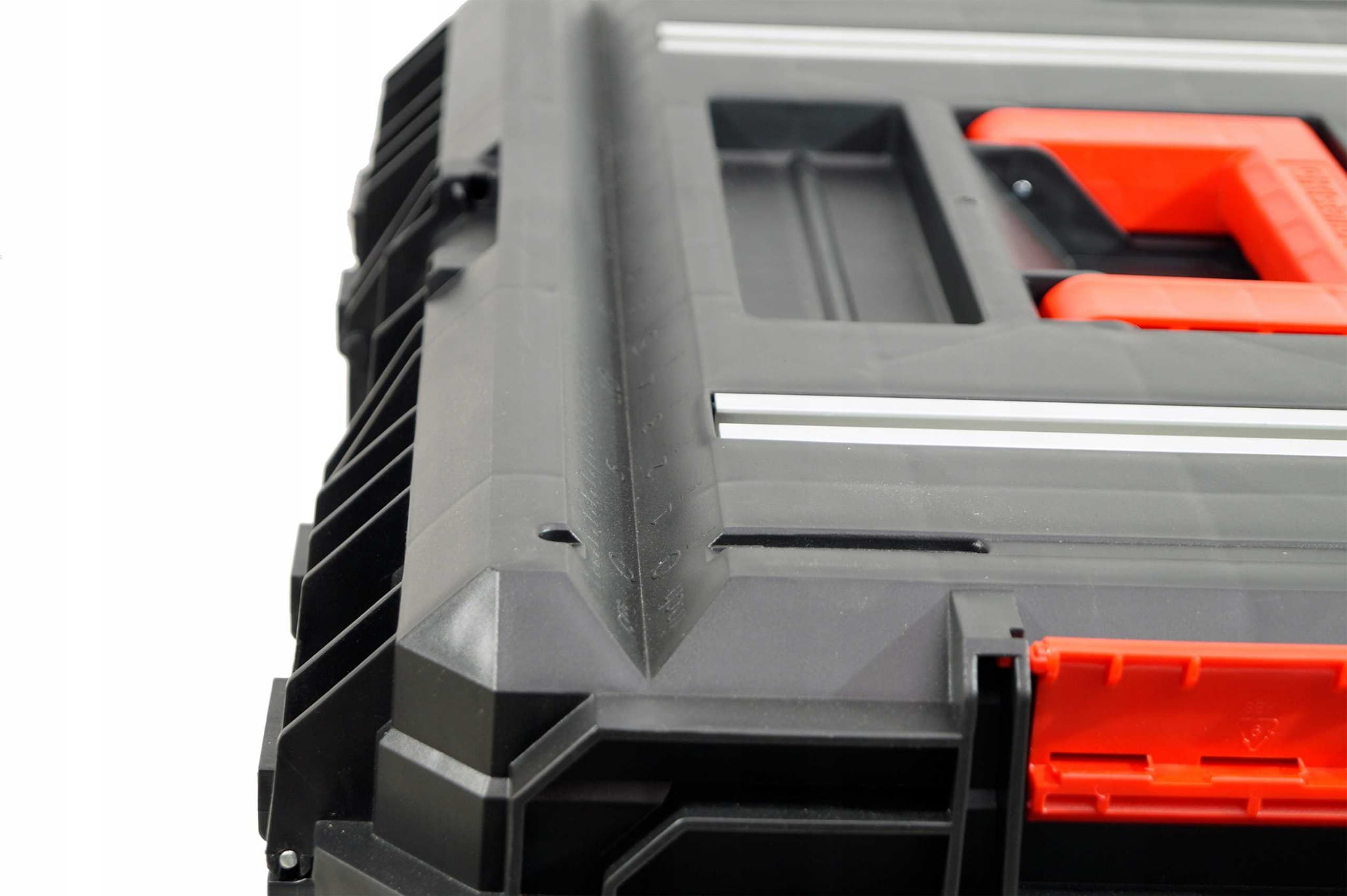 - Aluminiowe szyny pozwalające zamontować ściski stolarski co czyni ze skrzyni kompaktowy „stół do prac warsztatowych”.