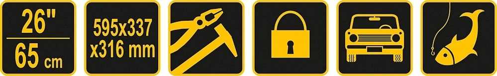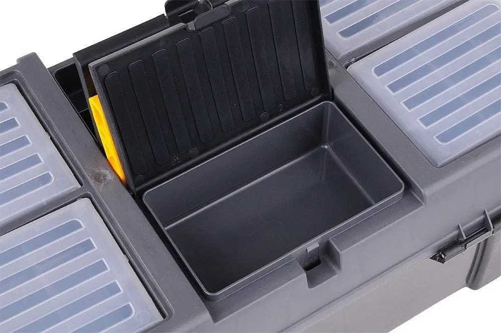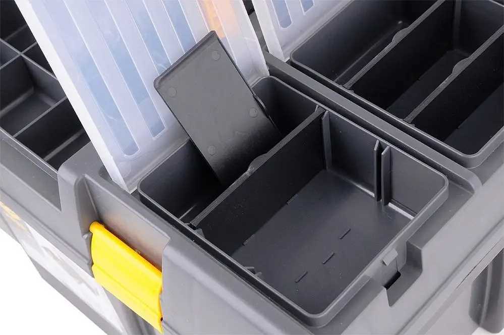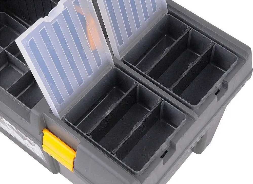 Skrzynka narzędziowa 26" z wyciąganą tacką z uchwytem na bity oraz dodatkowymi organizerami do przechowywania drobnych przedmiotów.