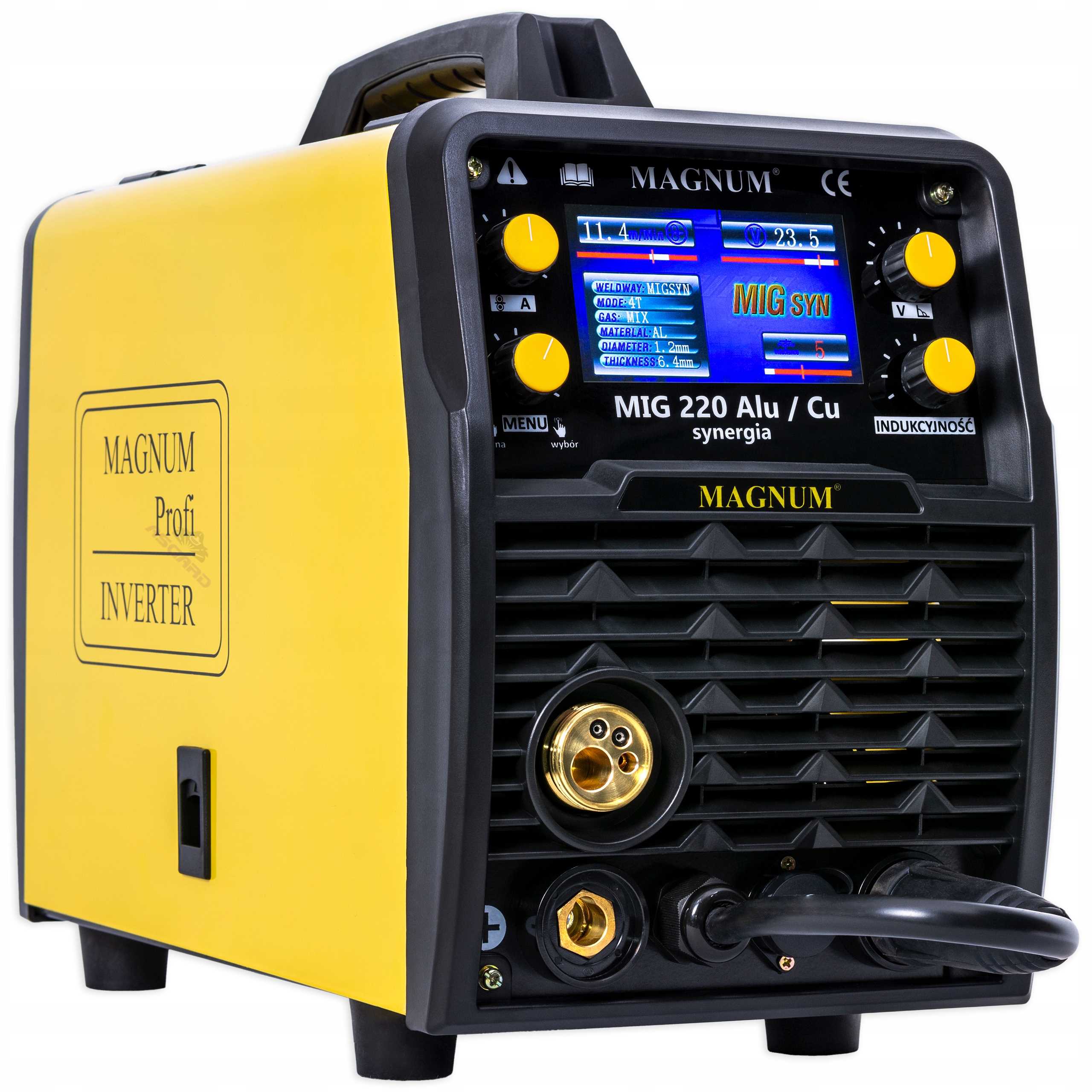 Spawarka MIG 220 ALU SYNERGIA marki MAGNUM jest lekkim, przenośnym półautomatem spawalniczym wykonanym w technologii inwertorowej, zasilanym z sieci jednofazowej 230V o maksymalnym prądzie spawania 200A. Urządzenie wyposażone jest w duży numeryczny oraz graficzny ekran LCD z intuicyjny, łatwy w obsłudze panel sterowani. Zastosowana w urządzeniu funkcja synergii pozwala na szybkie ustawienie parametrów spawania.