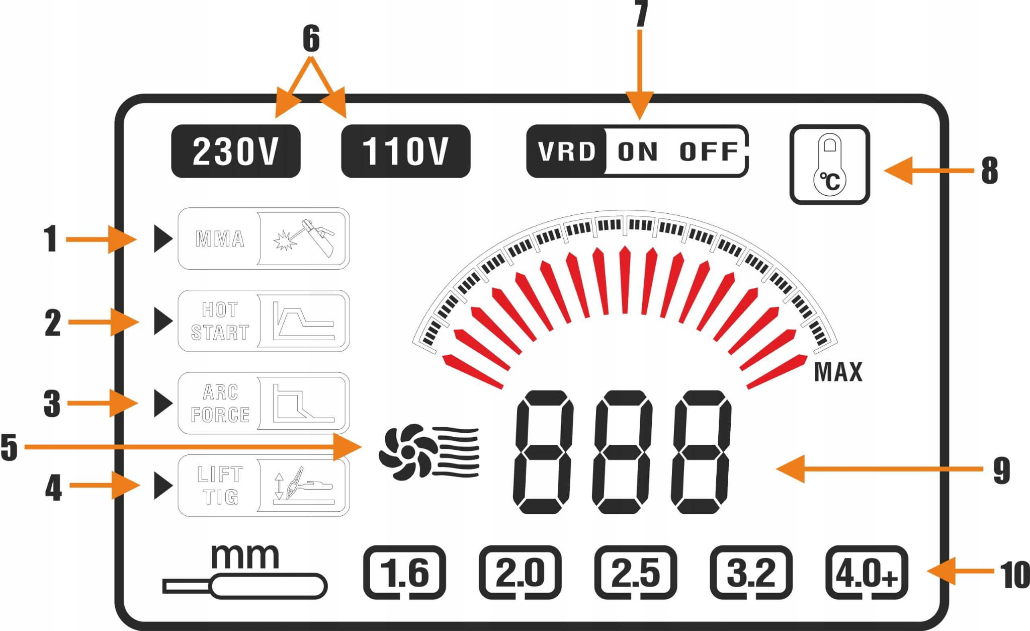 9. Cyfrowy wyświetlacz pokazujący ustawione moc spawarki