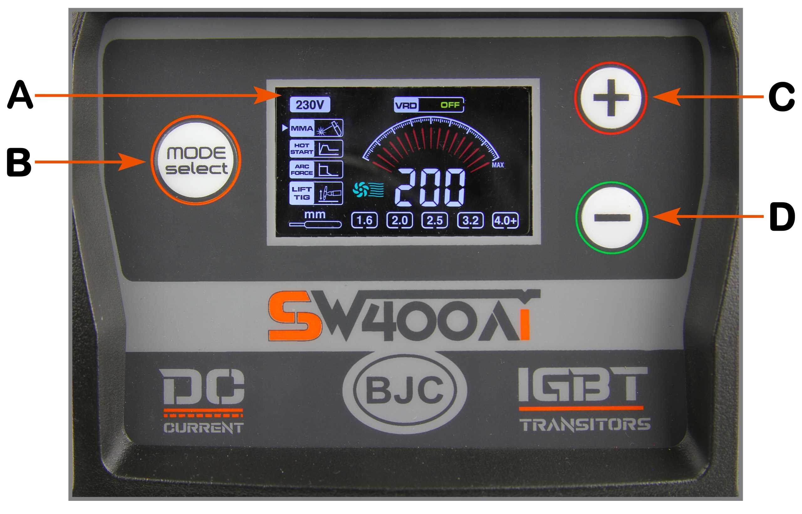 W spawarce BJC SW400Ai zastosowano system VRD. Bezpieczeństwo spawacza w dużej mierze zależy od funkcjonalności użytkowanego sprzętu. Producenci spawarek przywiązują wagę do tego, aby oferowane przez nich urządzenia zapewniały komfortową pracę i zmniejszały ryzyko wypadku do minimum. VRD – to system redukcji napięcia, którego zadaniem jest wyłączenie zasilania w ciągu kilku milisekund po skończeniu spawania. Funkcja ta odpowiada także za redukcję napięcia na elektrodzie otulonej do bezpiecznego poziomu. Aby włączyć VRD należy przytrzymać przez parę sekund przycisk (B) mode select