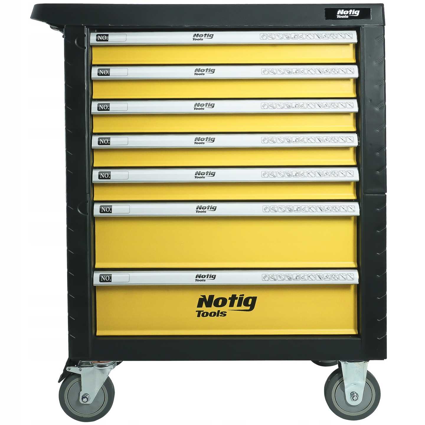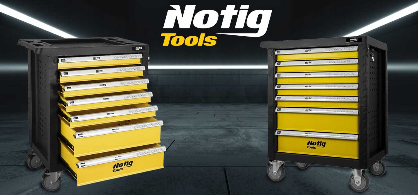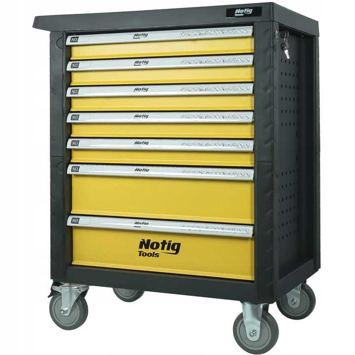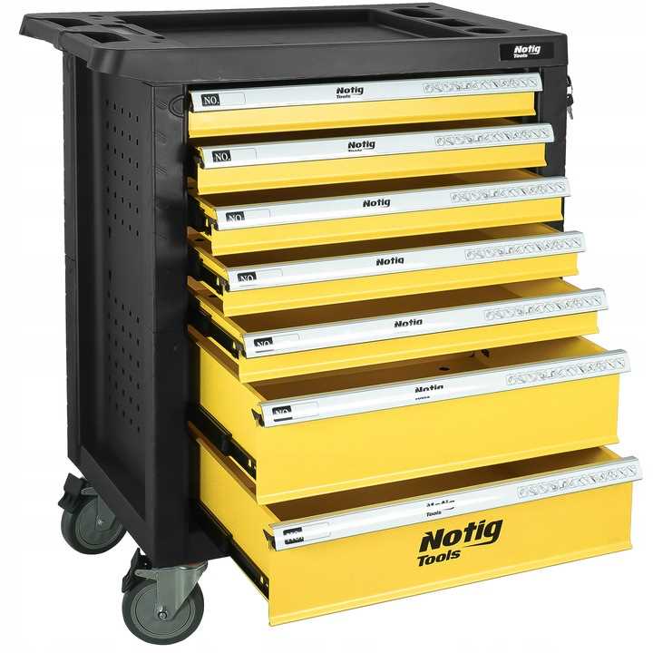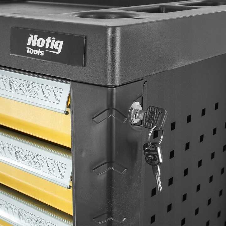 Szafka narzędziowa Notig Tools posiada 7 praktycznych szuflad na narzędzia, zamykanych za pomocą zamka centralnego. Wszystkie szuflady są w pełni otwierane, posiadają metalowe prowadnice kulkowe, zapewniające długoletnie, płynne i niezawodne działanie. Szuflady zabezpieczone są blokadą zapadkową, która zapewnia ochronę otoczenia w czasie transportu. Powierzchnia blatu roboczego odporna jest na działanie oleju i smarów. Pięcio calowe, ciche, skrętne koła ułatwiają manewrowanie szafką dodatkowo wyposażone są w hamulec. Szafka wyposażona jest w uchwyt, który ułatwia prowadzenie. Pozwala utrzymać porządek na stanowisku pracy. Dzięki szufladom zamykanych na kluczyk chroni narzędzia przed kradzieżą.