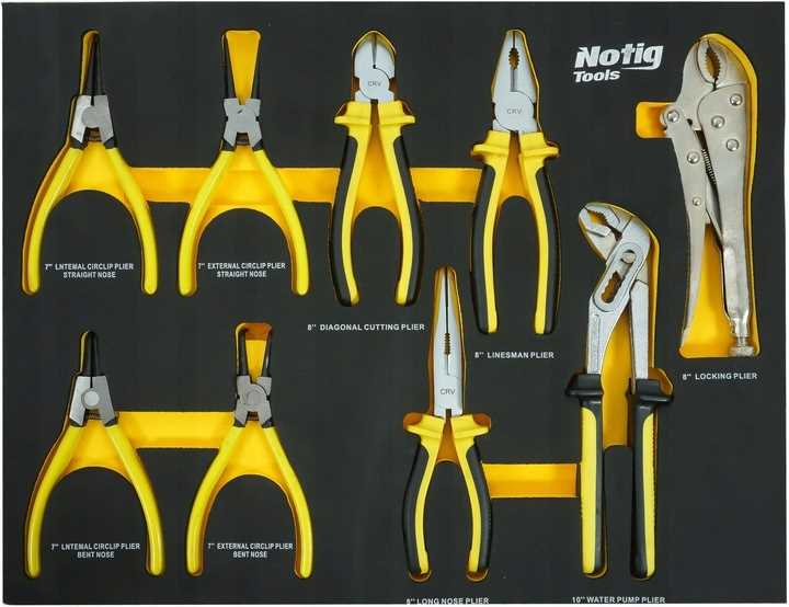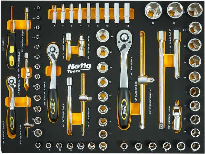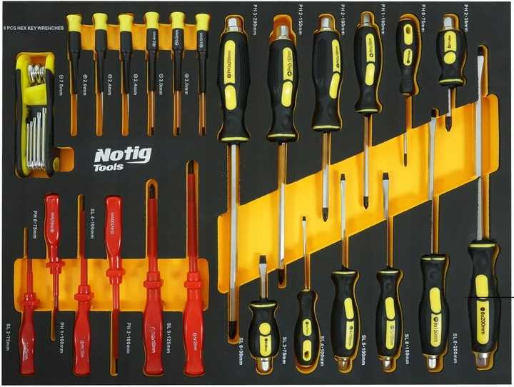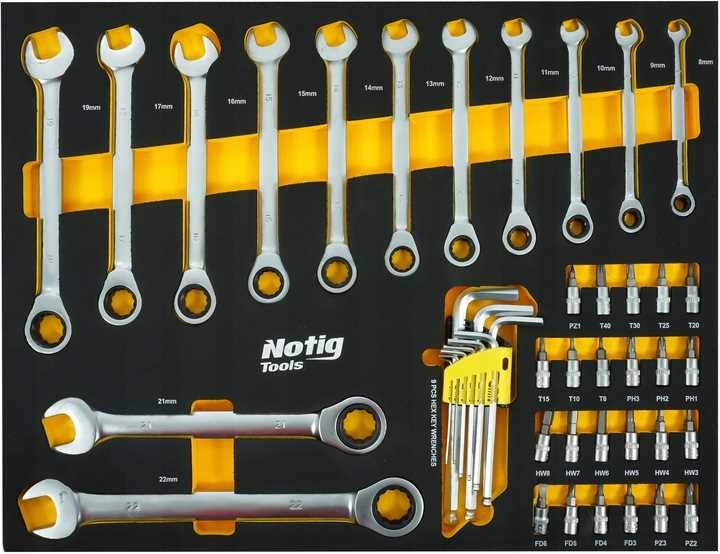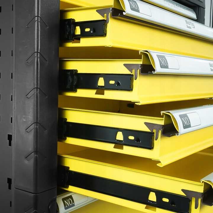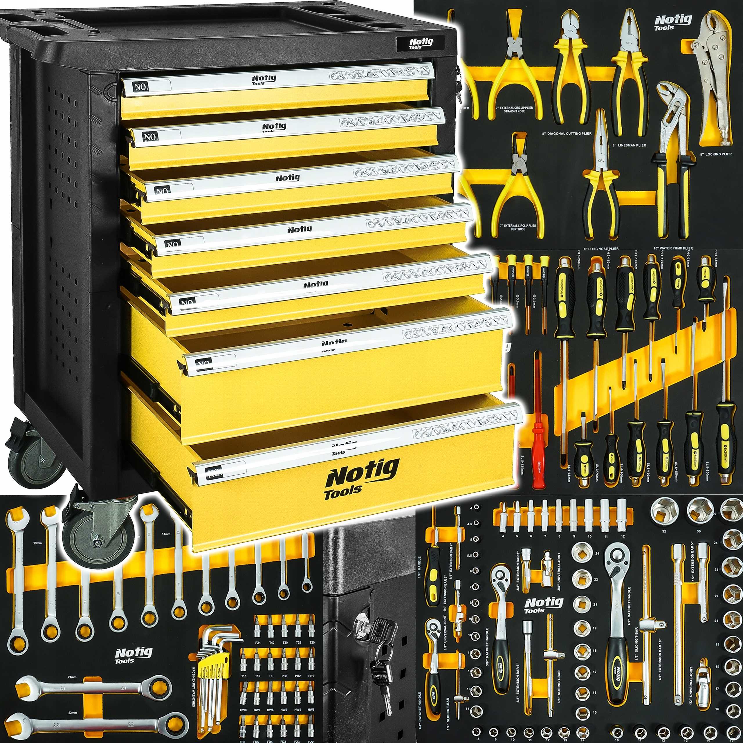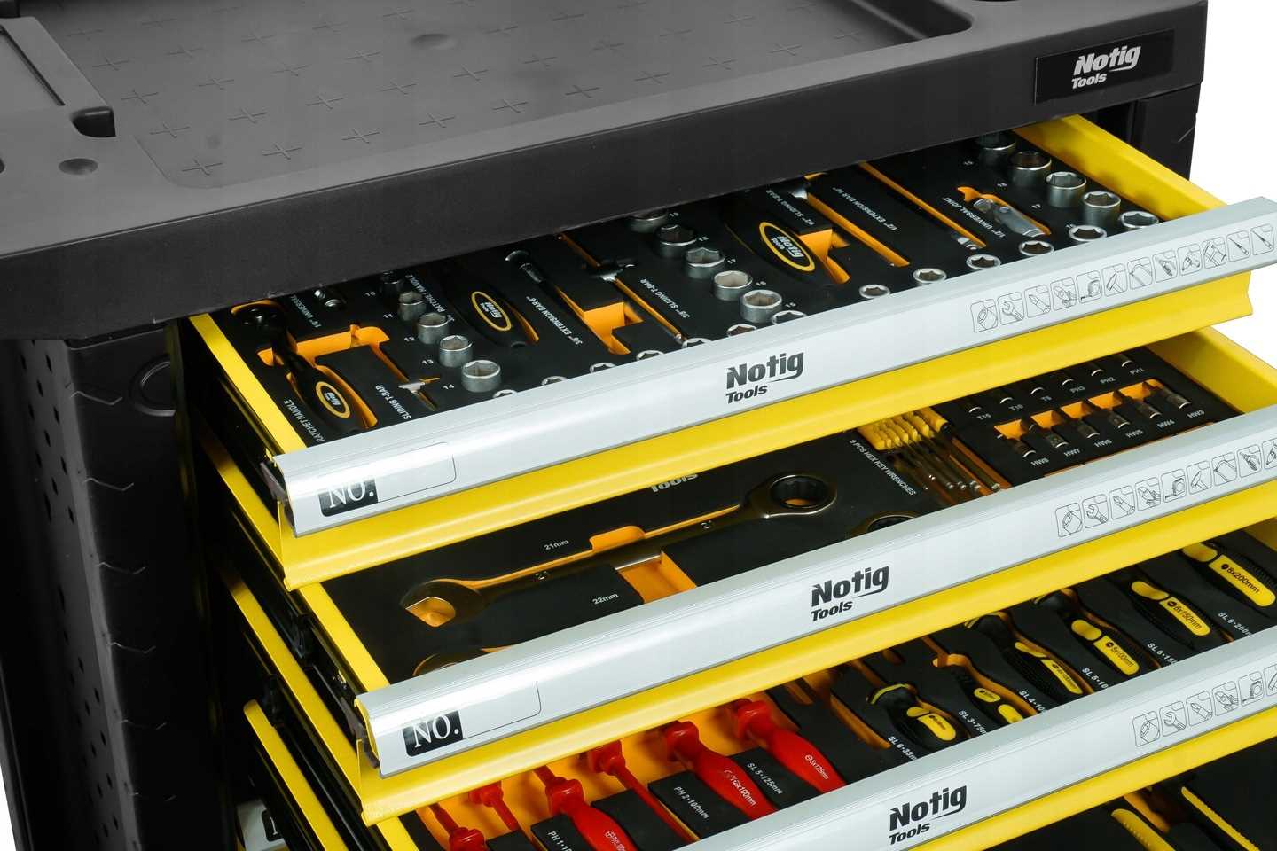 Szafka narzędziowa Notig Tools posiada 7 praktycznych szuflad na narzędzia, zamykanych za pomocą zamka centralnego. Wszystkie szuflady są w pełni otwierane, posiadają metalowe prowadnice kulkowe, zapewniające długoletnie, płynne i niezawodne działanie. Szuflady zabezpieczone są blokadą zapadkową, która zapewnia ochronę otoczenia w czasie transportu. Powierzchnia blatu roboczego odporna jest na działanie oleju i smarów. Pięcio calowe, ciche, skrętne koła ułatwiają manewrowanie szafką dodatkowo wyposażone są w hamulec. Szafka wyposażona jest w uchwyt, który ułatwia prowadzenie. Pozwala utrzymać porządek na stanowisku pracy. Dzięki szufladom zamykanych na kluczyk chroni narzędzia przed kradzieżą.