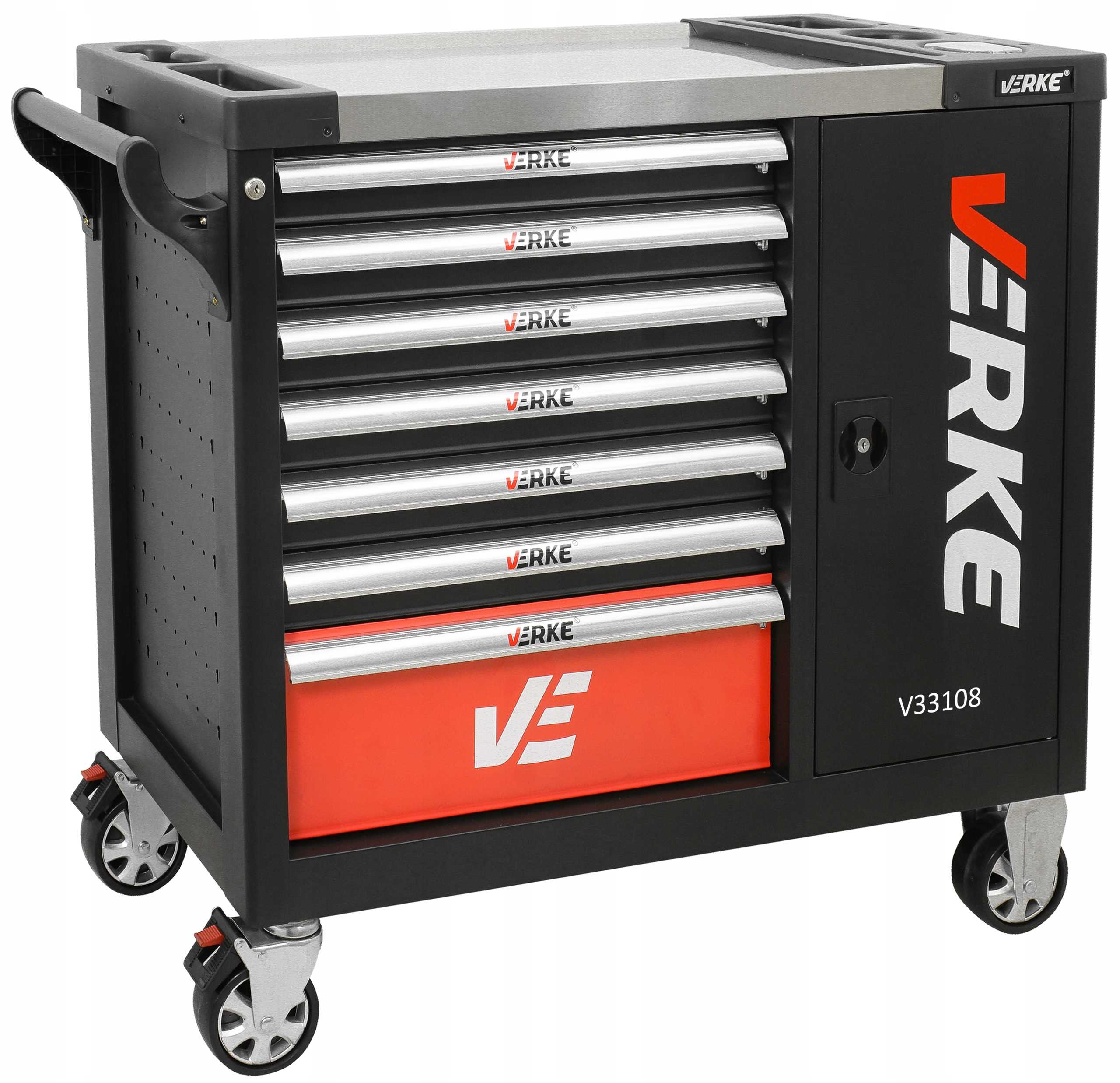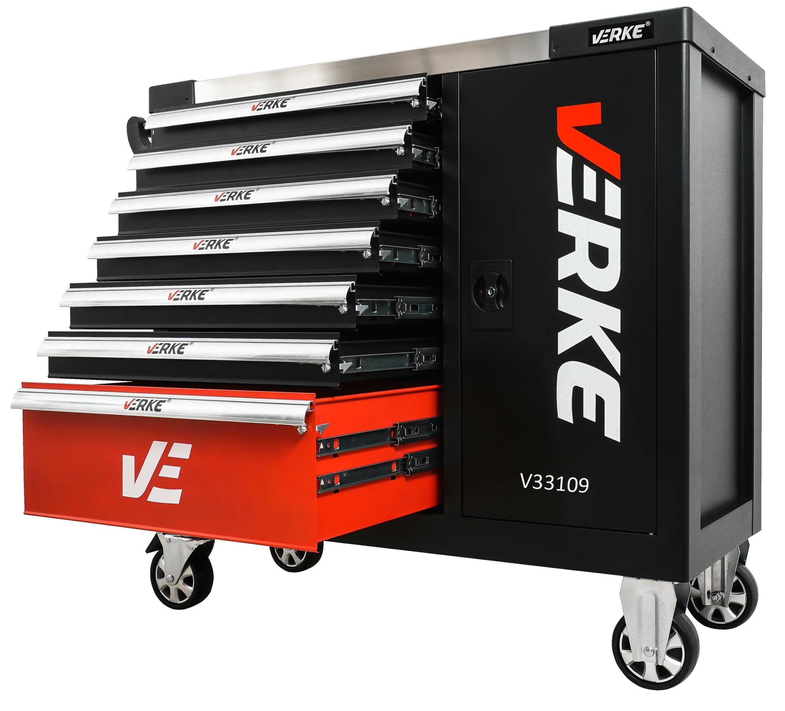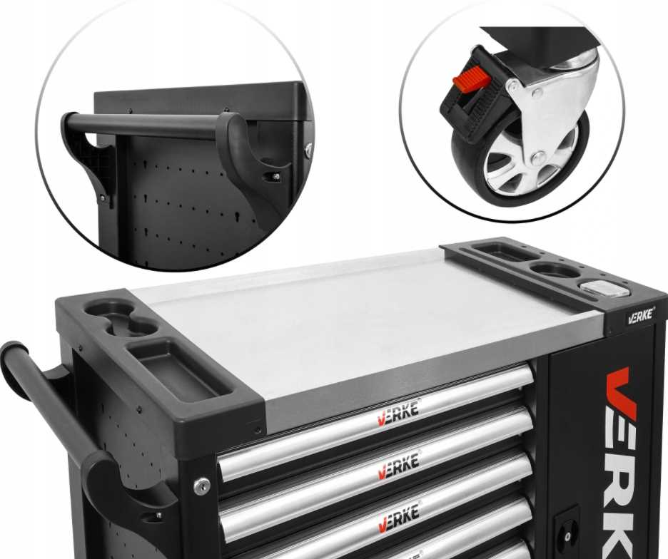 Szafka narzędziowa Verke posiada 7 praktycznych szuflad na narzędzia, zamykanych za pomocą zamka centralnego ( jednym zamkiem zamykamy wszystkie szuflady).