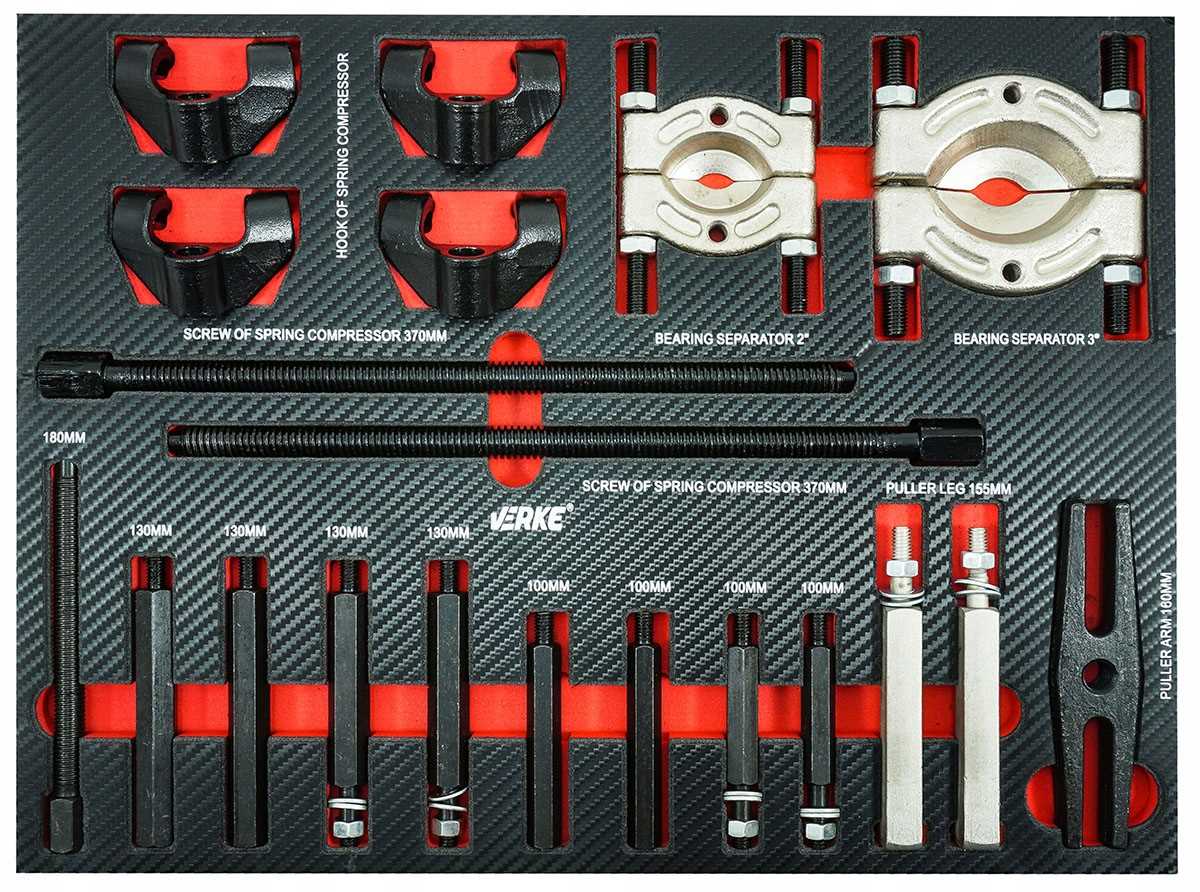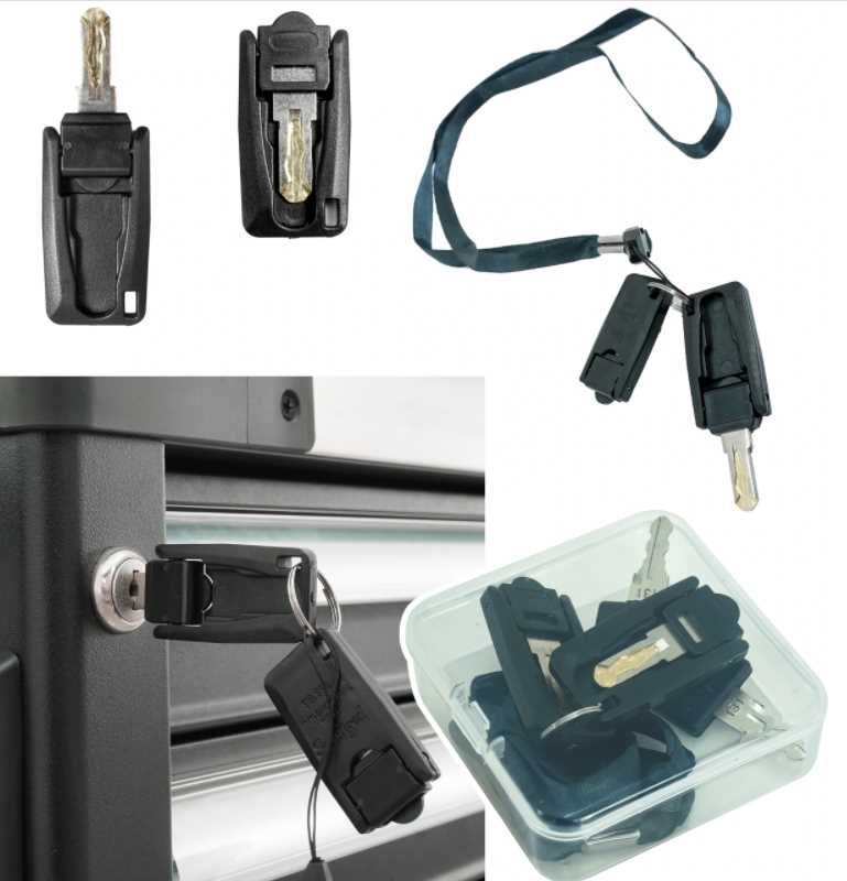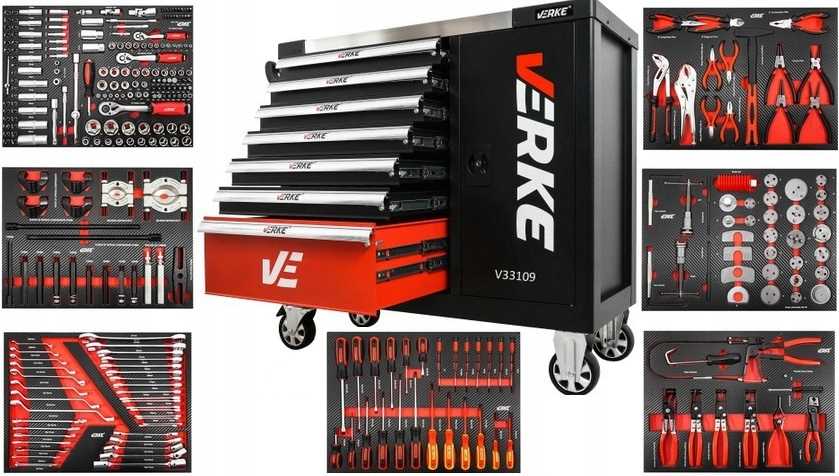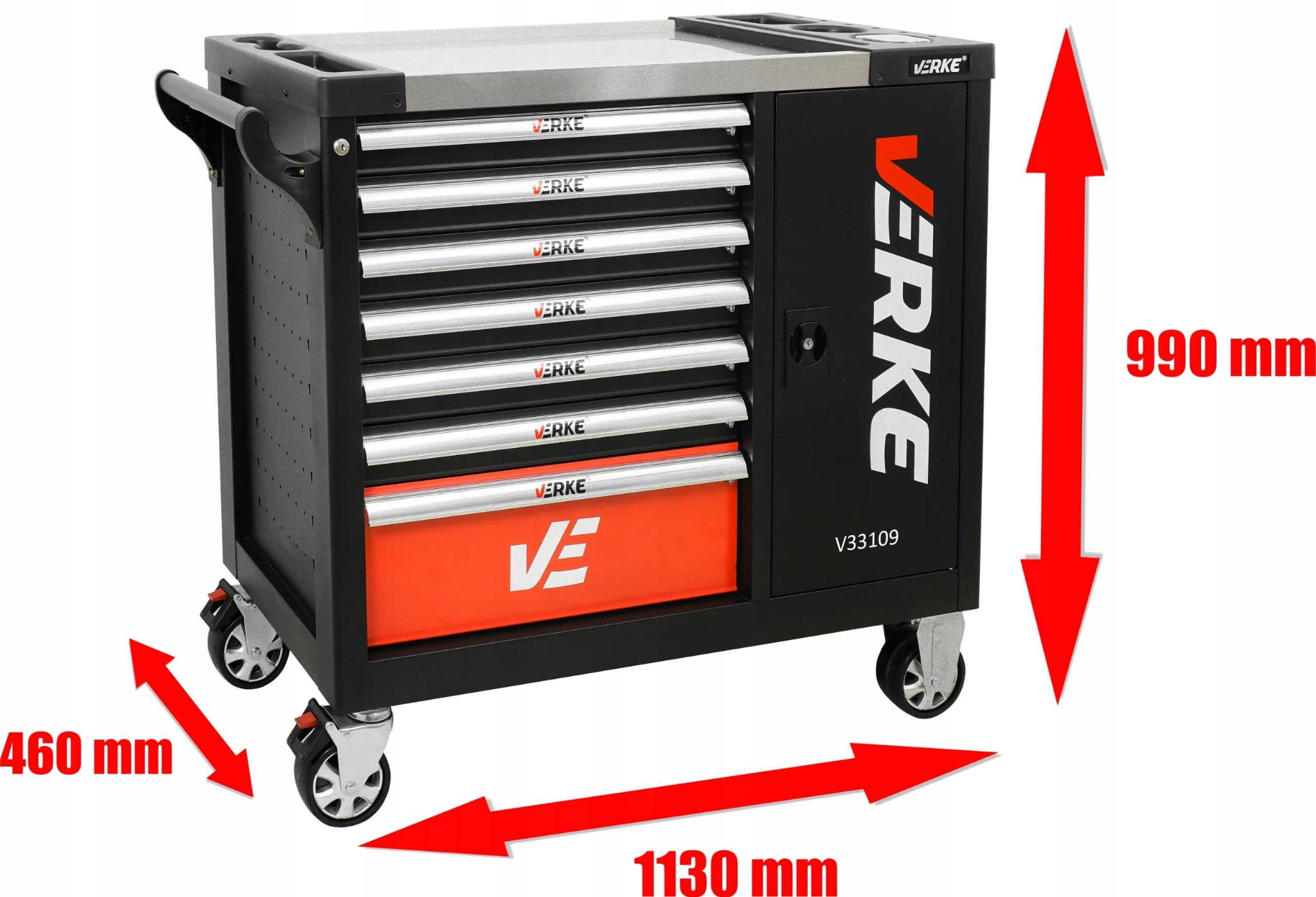Szafka narzędziowa Verke posiada 7 praktycznych szuflad na narzędzia, zamykanych za pomocą zamka centralnego ( jednym zamkiem zamykamy wszystkie szuflady).