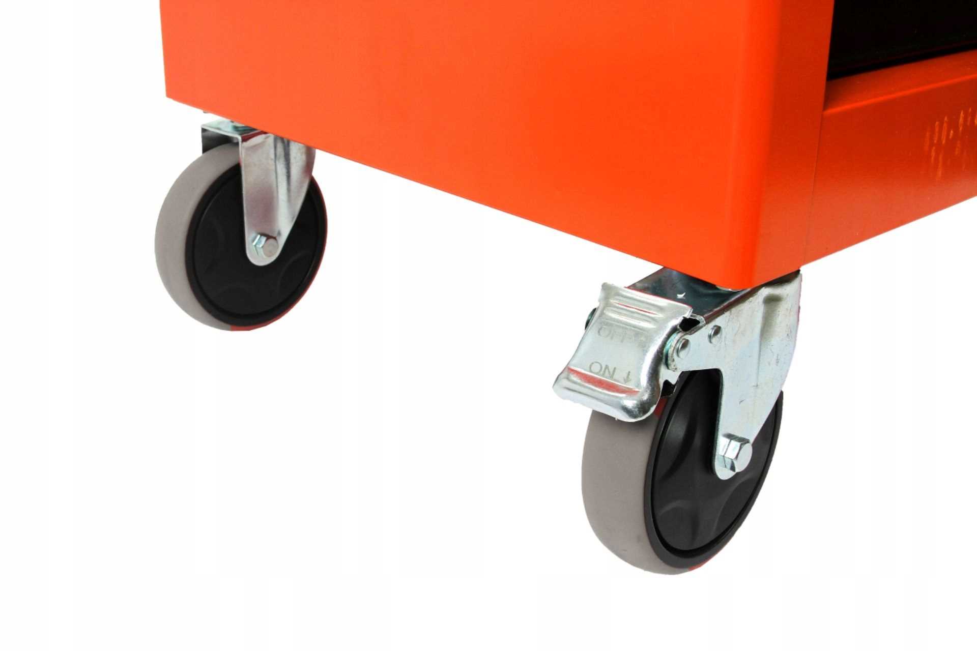 4 solidne kółka jezdne w tym 2 skrętne , ułatwiające manewrowanie szafką. Wózek warsztatowy jest wyposażony w mocny hamulec , za pomocą którego możemy zatrzymać szafkę w ustalonej pozycji.