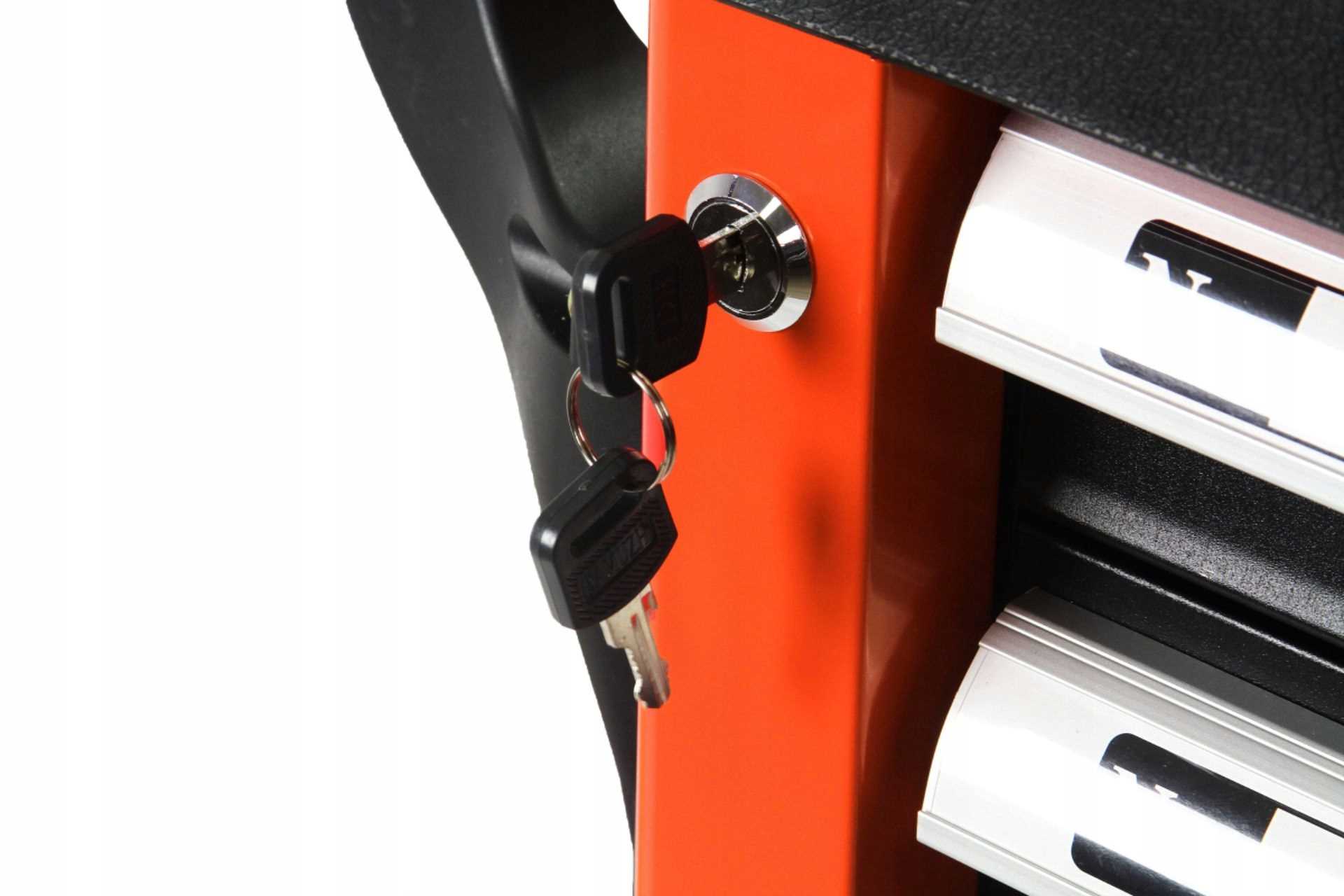 Centralny zamek z dwoma kluczami zamykający wszystkie szuflady oraz podwójne ściank i zabezpieczają narzędzia przed niepożądanym dostępem lub kradzieżą , zapasowy kluczyk w zestawie w przypadku zgubienia jednej sztuki.