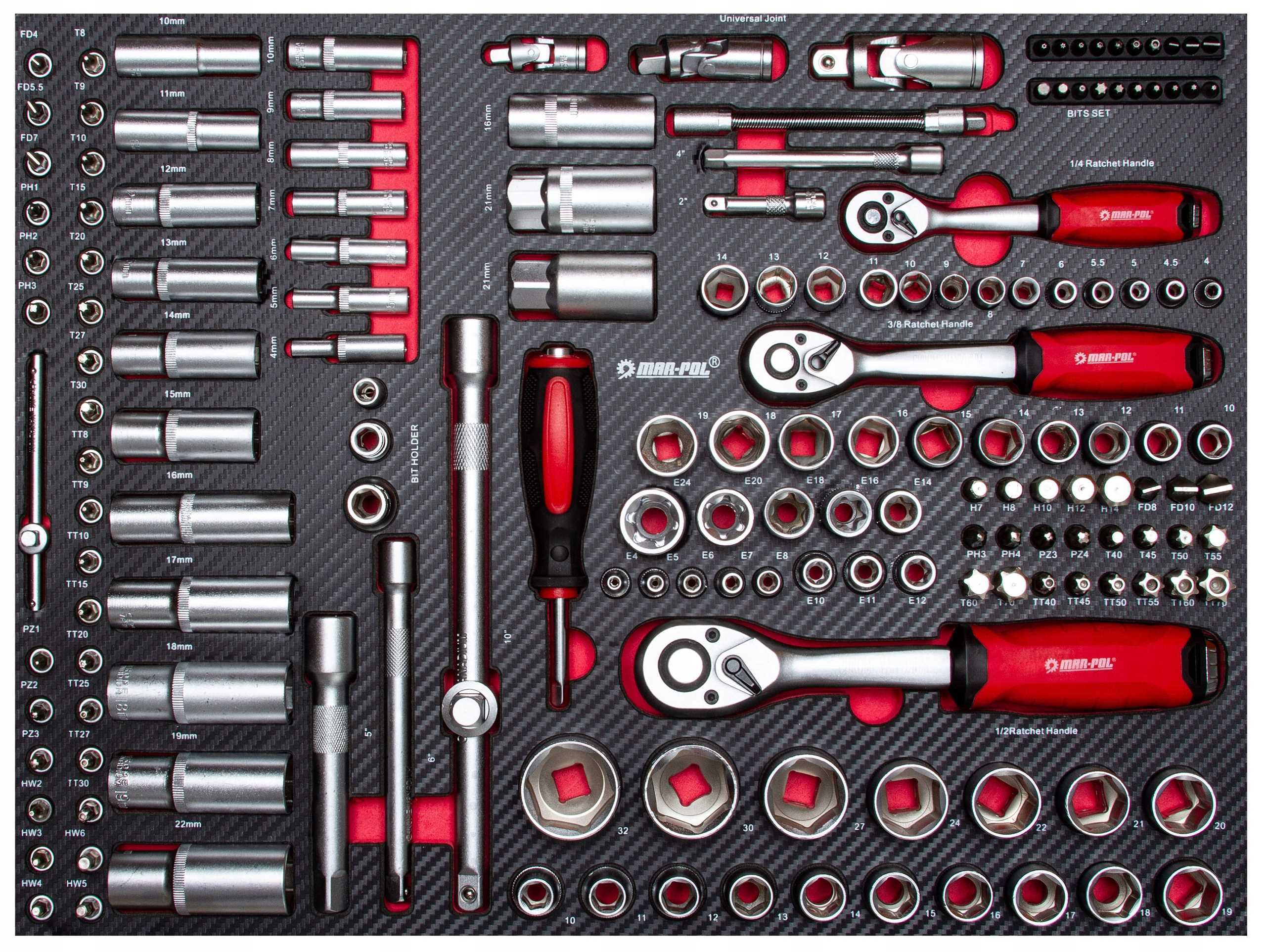 - Uniwersalne gniazdo przegubowe (3 sztuki): 1/4";3/8";1/2"