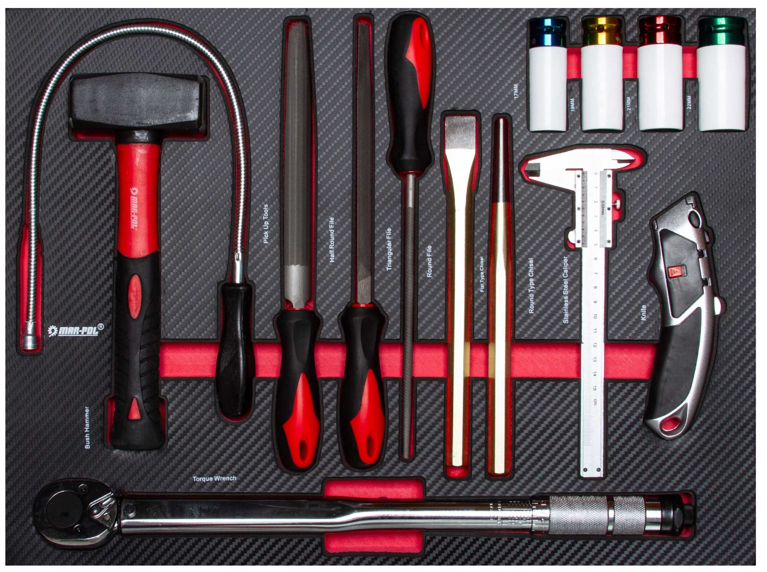 - Nasadki 1/2" (17 sztuk): 10;11;12;13;14;15;16;17;18;19;20;21;22;24;27;30;32; mm