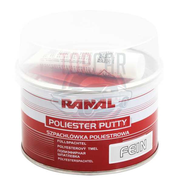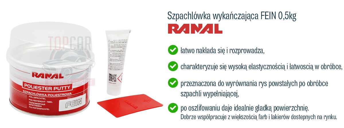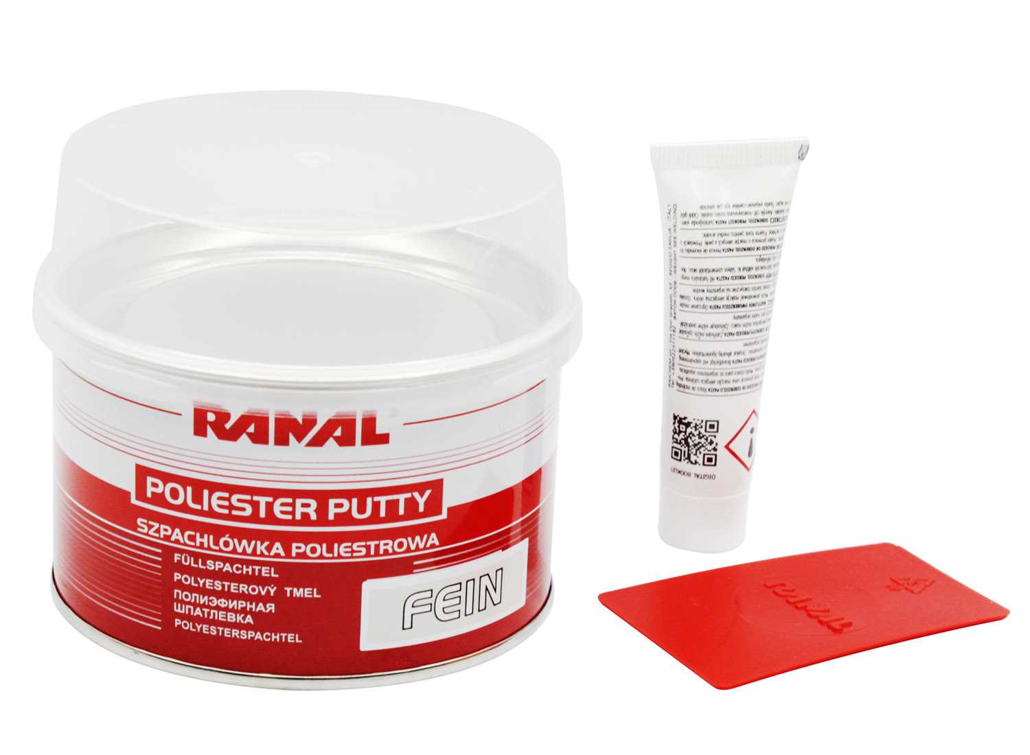 Dwuskładnikowa mikrodrobna szpachla poliestrowa RANAL FEIN 0,50kg przeznaczona jest do wyrównywania rys powstałych po obróbce szpachli wypełniającej. Służy jednocześnie do wyrównywania drobnych zarysowań na