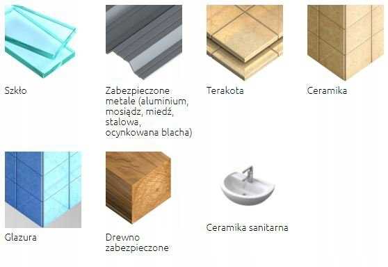 - • Zabezpieczone metale (aluminium, mosiądz, miedź, stalowa, ocynkowana blacha)