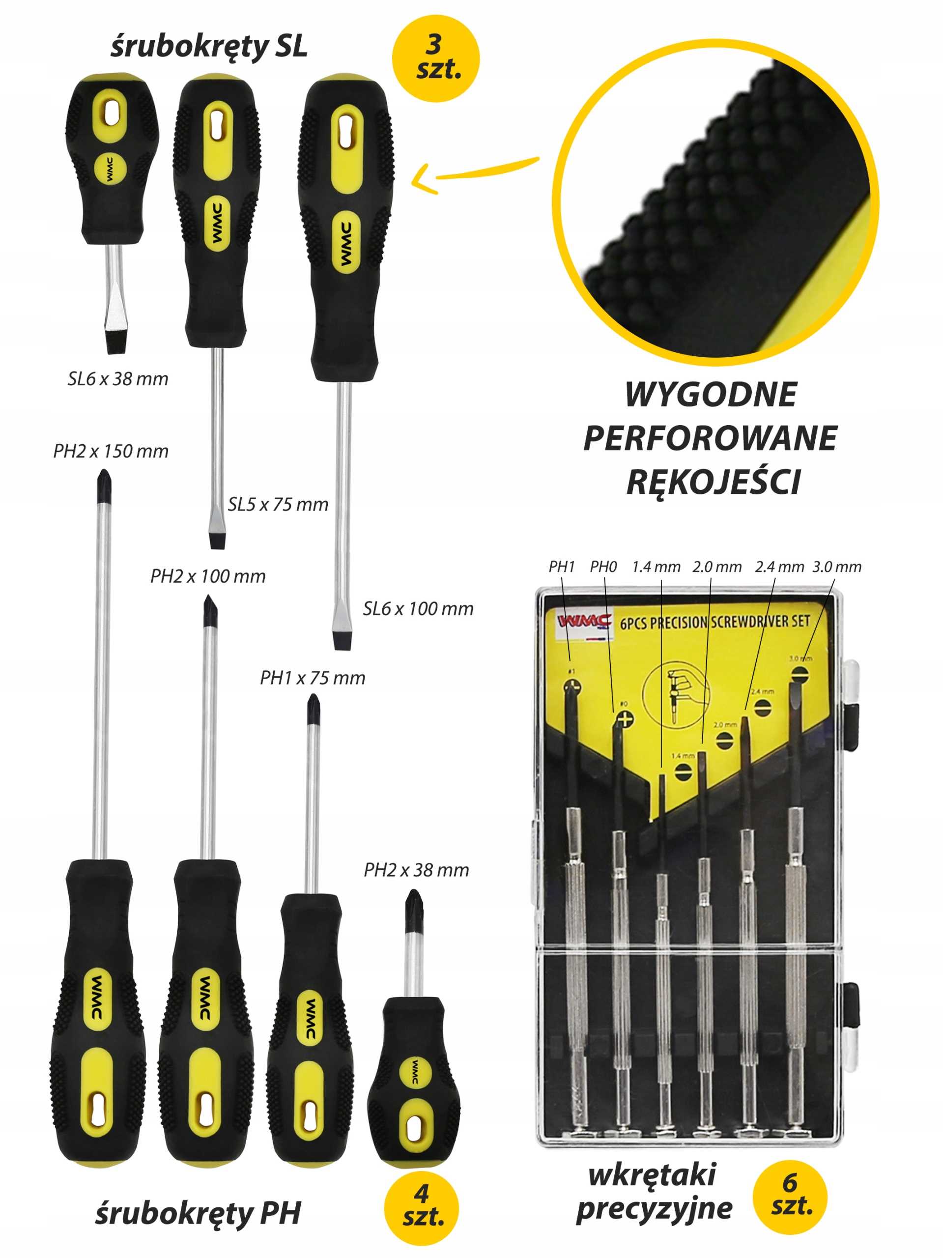 - Śrubokręty PH – 4 szt.: 2x38 mm, 1x75 mm, 2x100 mm, 2x150 mm