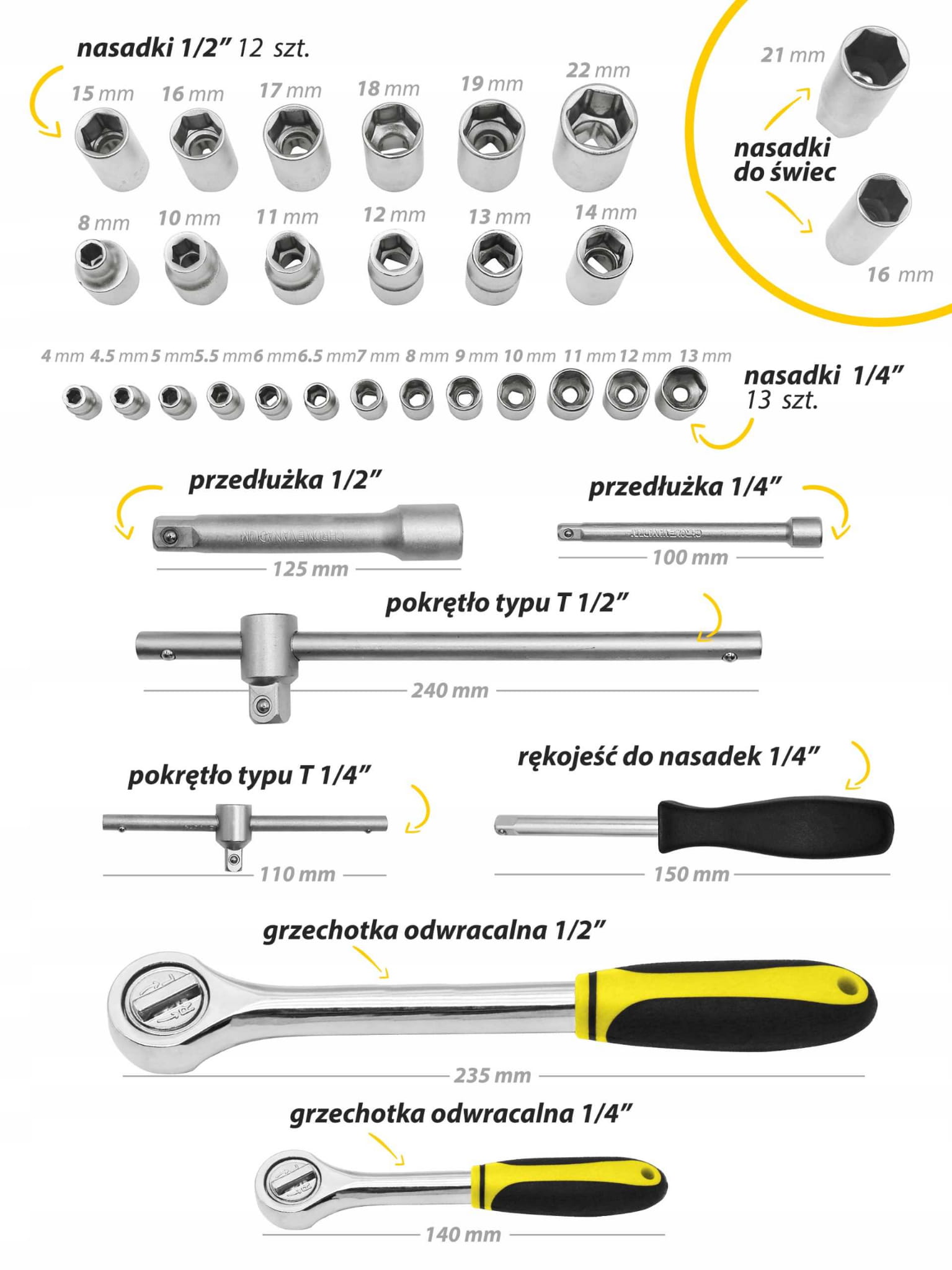 - Nasadki 1/4" – 13 szt.: 4 mm, 4.5 mm, 5 mm, 5.5 mm, 6 mm, 6.5 mm, 7 mm, 8 mm, 9 mm, 10 mm, 11 mm, 12 mm, 13 mm
