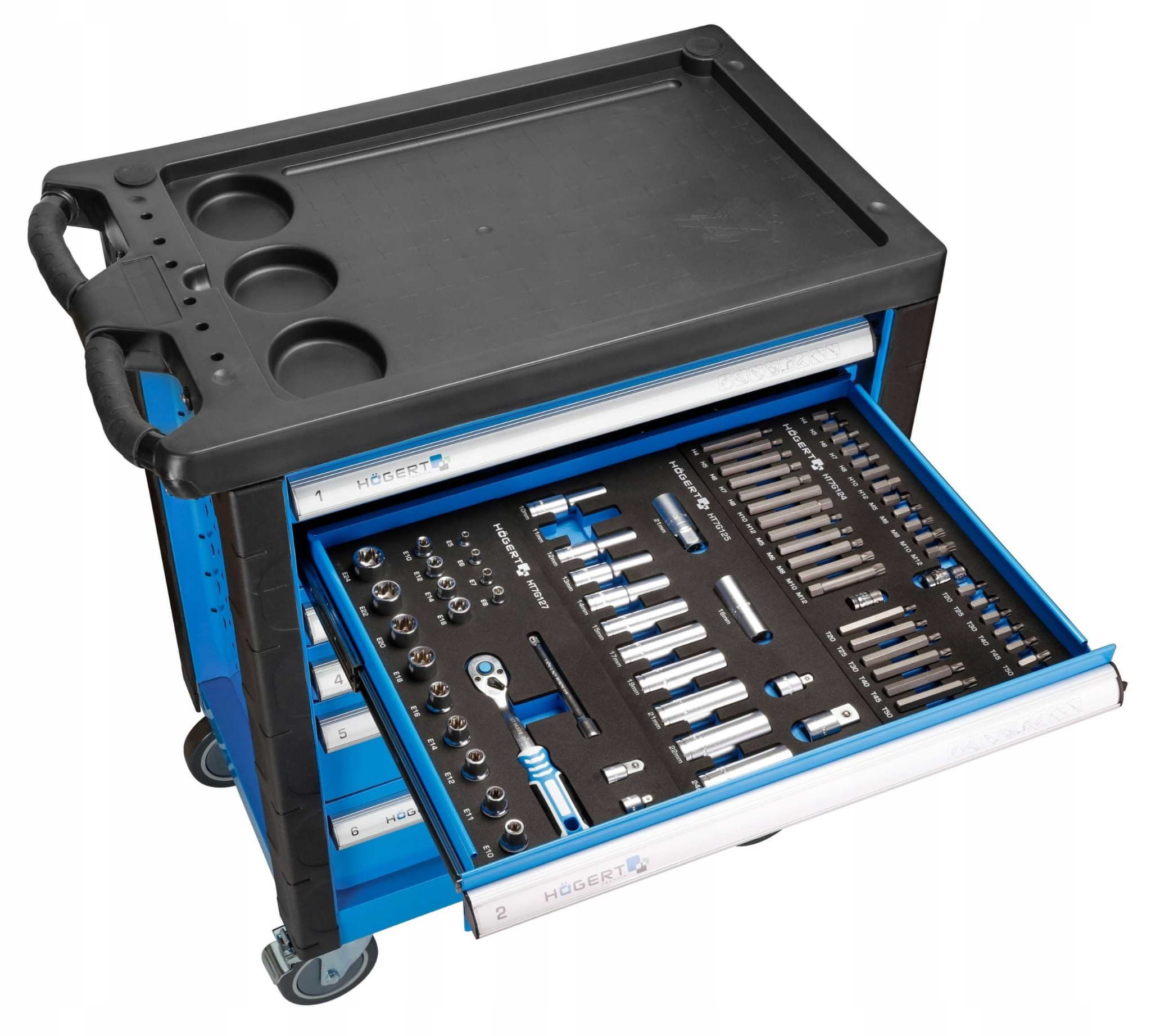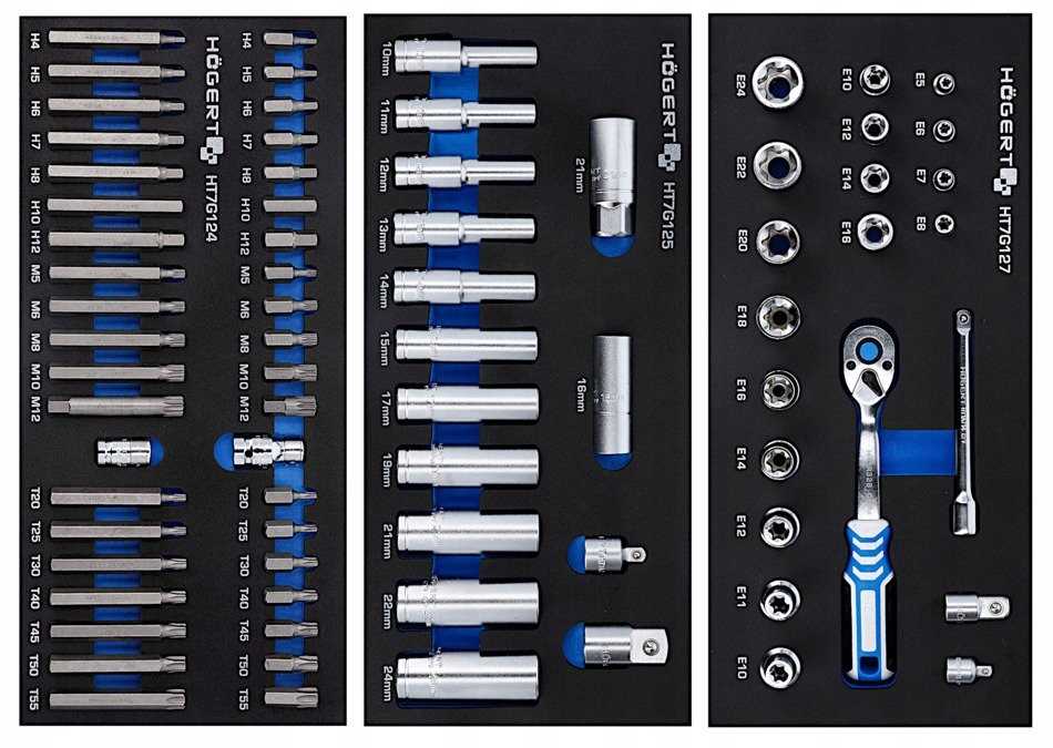 - Wkład HT7G127 Zestaw narzędzi z grzechotką 3/8”, 22 sztuk (HT1A884 (nasadki 1/4”: E5, E6, E7, E8, 3/8”: E10, E12, E14, E16; adapter HT1A771), adapter HT1A772, przedłużka 3/8” HT1A714, grzechotka 3/8” HT1R328, zawartość HT1A880 (nasadki 1/2”, E10, E11, E12, E14, E16, E18, E20, E22, E24)