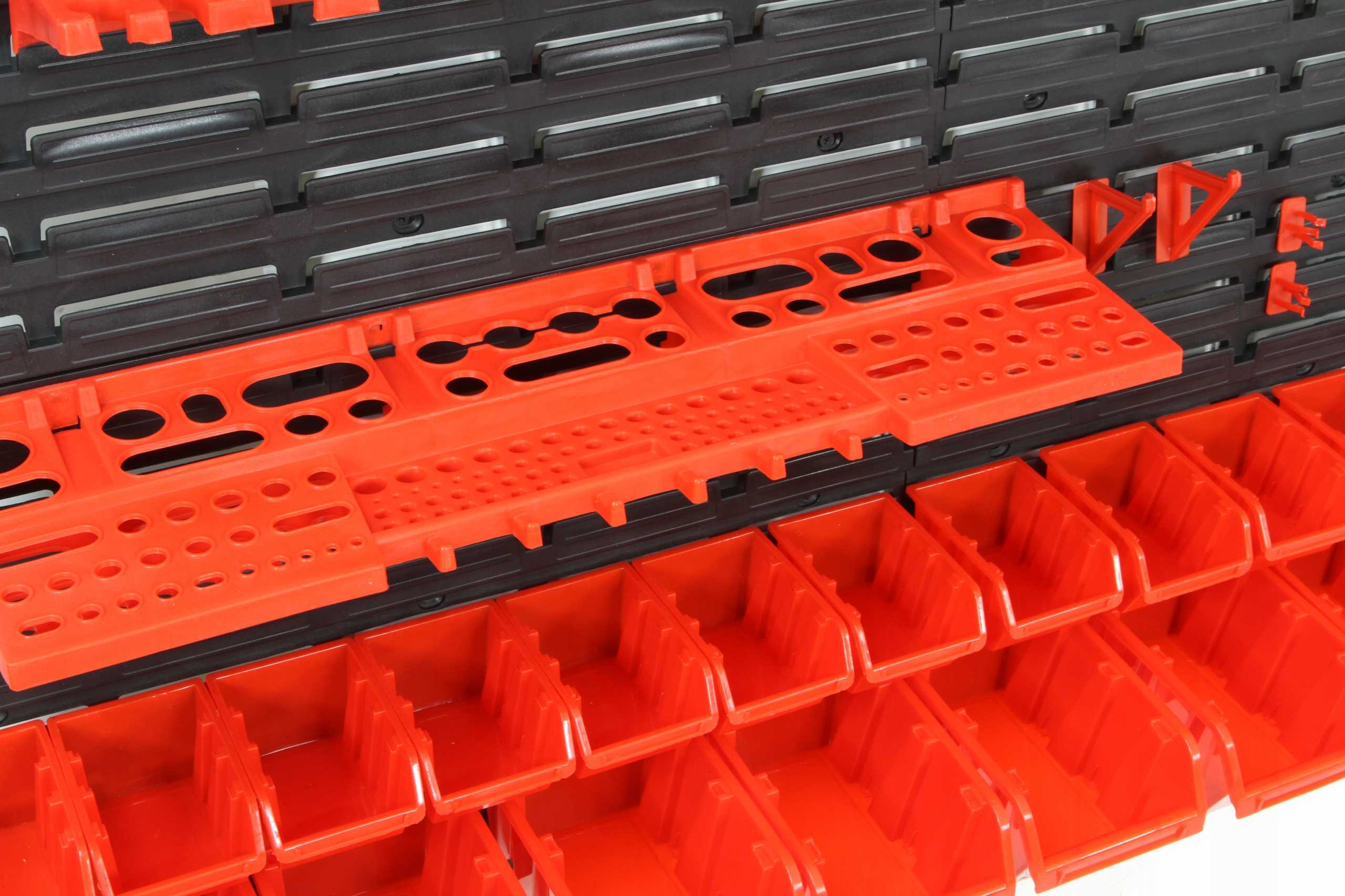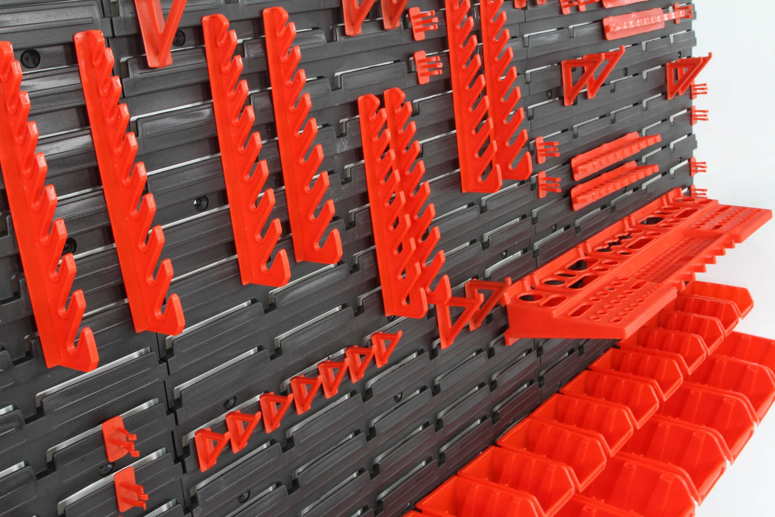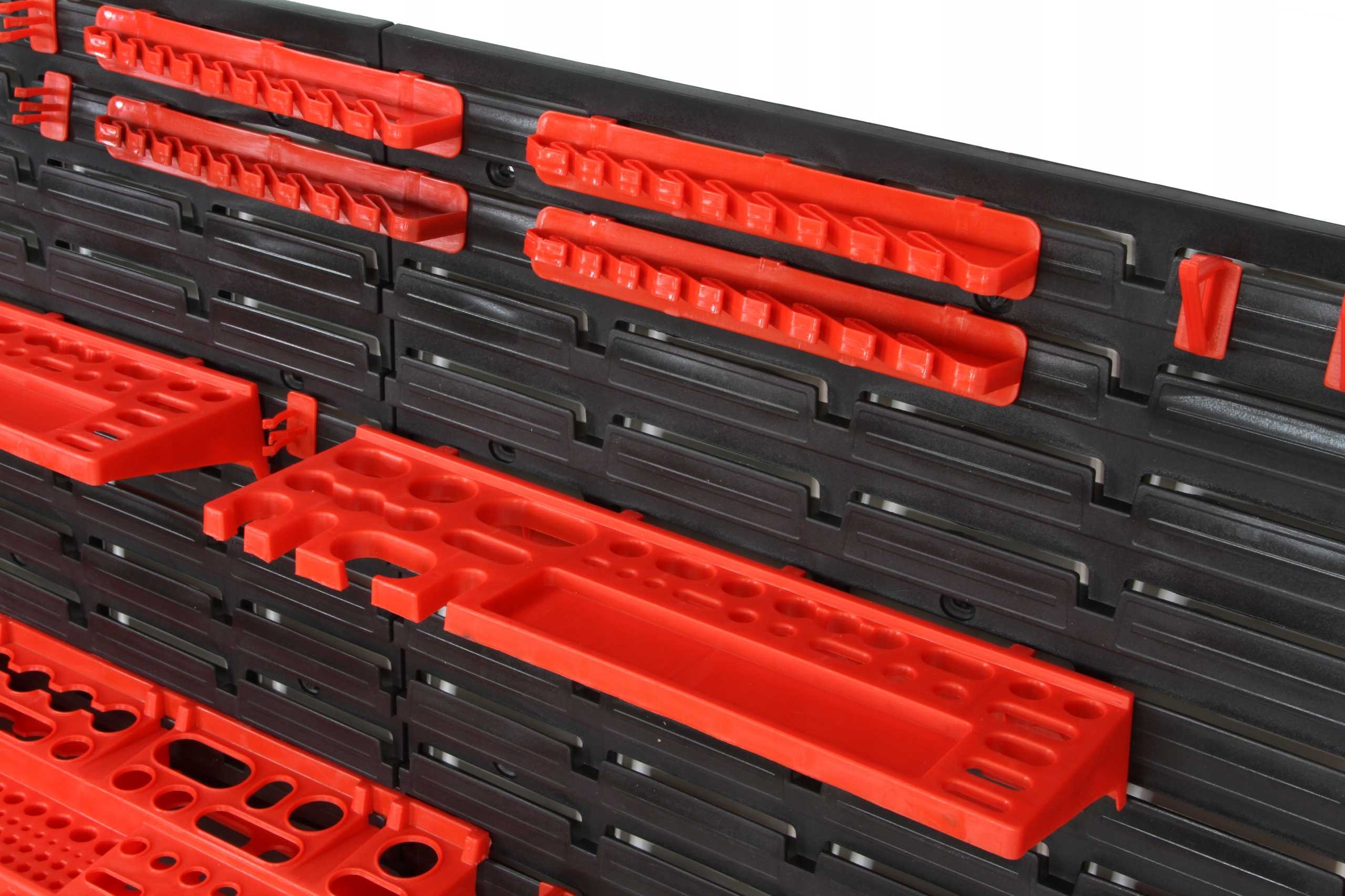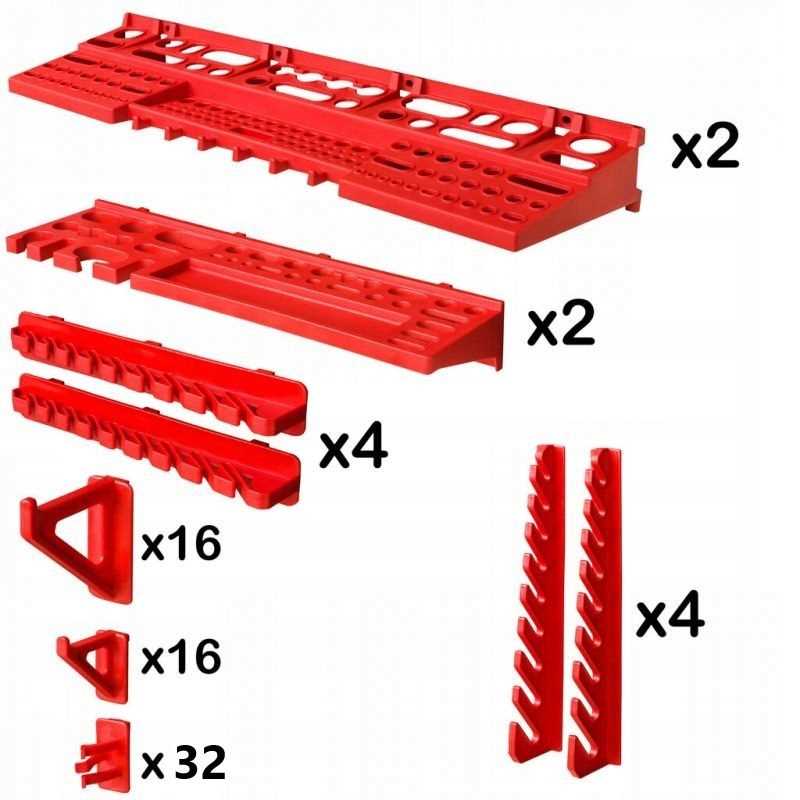 Świetny dodatek stanowią wytrzymałe uchwyty i półki narzędziowe pomagające przechowywać dłuższe narzędzia tj. młotek, wiertła, klucze, śrubokręt czy kombinerki. Dzięki uchwytom najważniejsze narzędzia będą zawsze pod ręką i zajmą znacznie mniej miejsca w warsztacie. Praktyczne oraz świetnie wyglądające rozwiązanie.