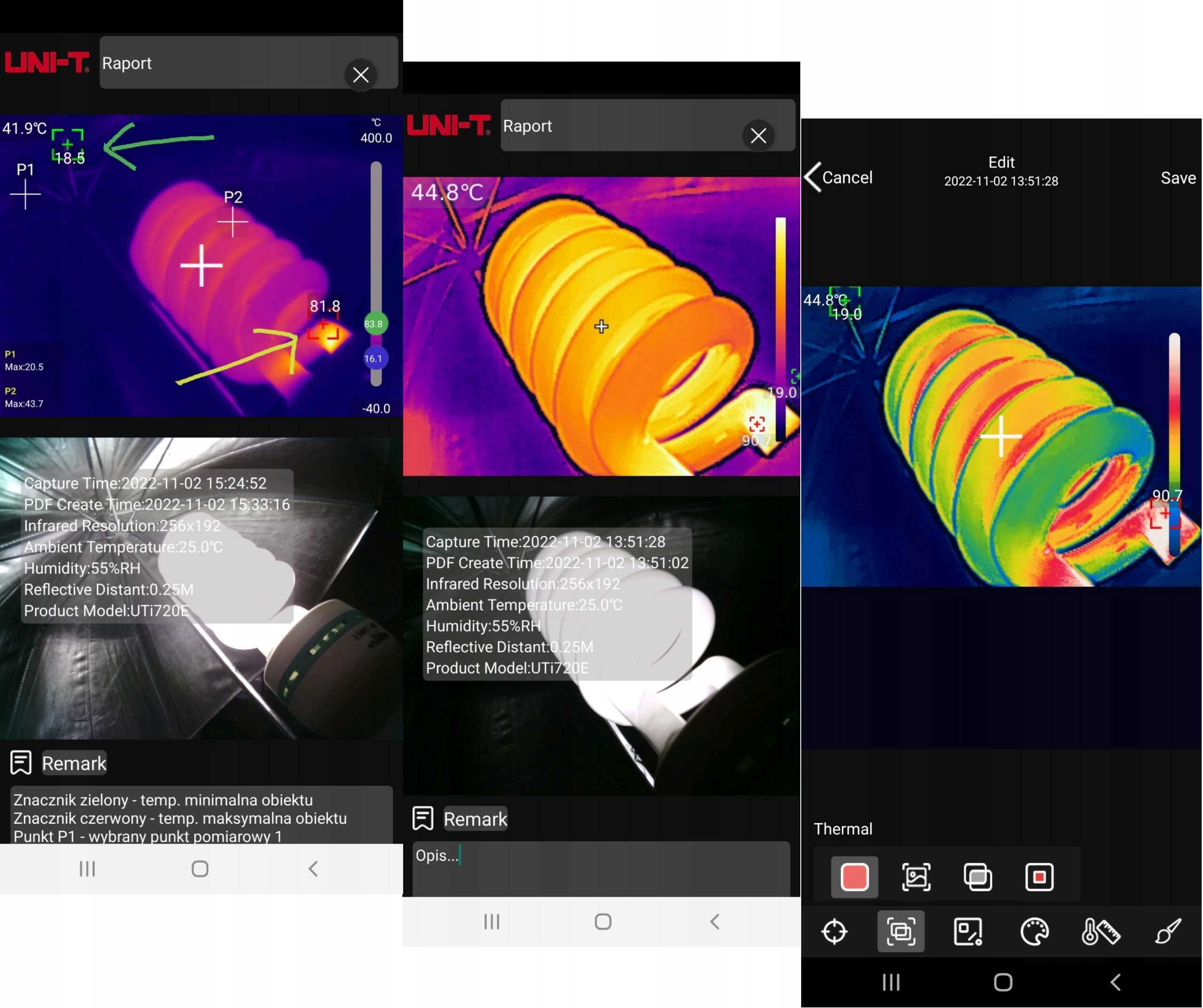 - Wygenerowanie RAPORTU pomiaru z zdjęciem IR i obrazem widzialnym oznaczonego zdjęcia wraz z dodanym opisem w formacie PDF