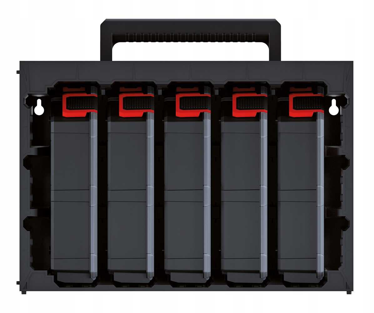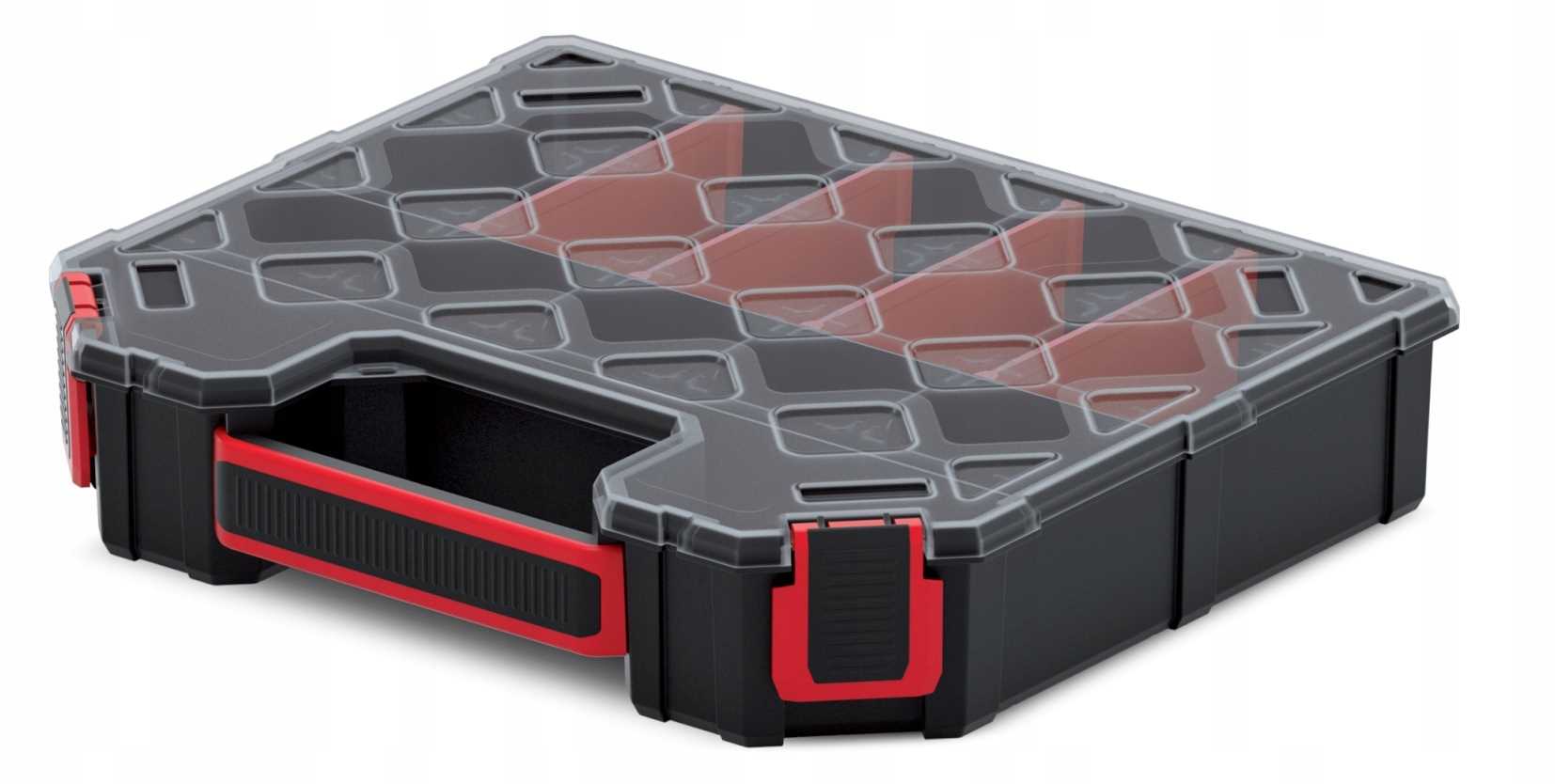 W skład oferowanej skrzynki wchodzi 5 organizerów TAGER o wymiarach 284x243x60 mm. Organizer ten charakteryzuje korpus wykonany z mieszanki polimerów o podwyższonej wytrzymałości, oraz transparentna pokrywka. Dodatkowo przegrody organizera są wyciągane dzięki czemu będziemy mogli stworzyć swoją własną kompozycję.