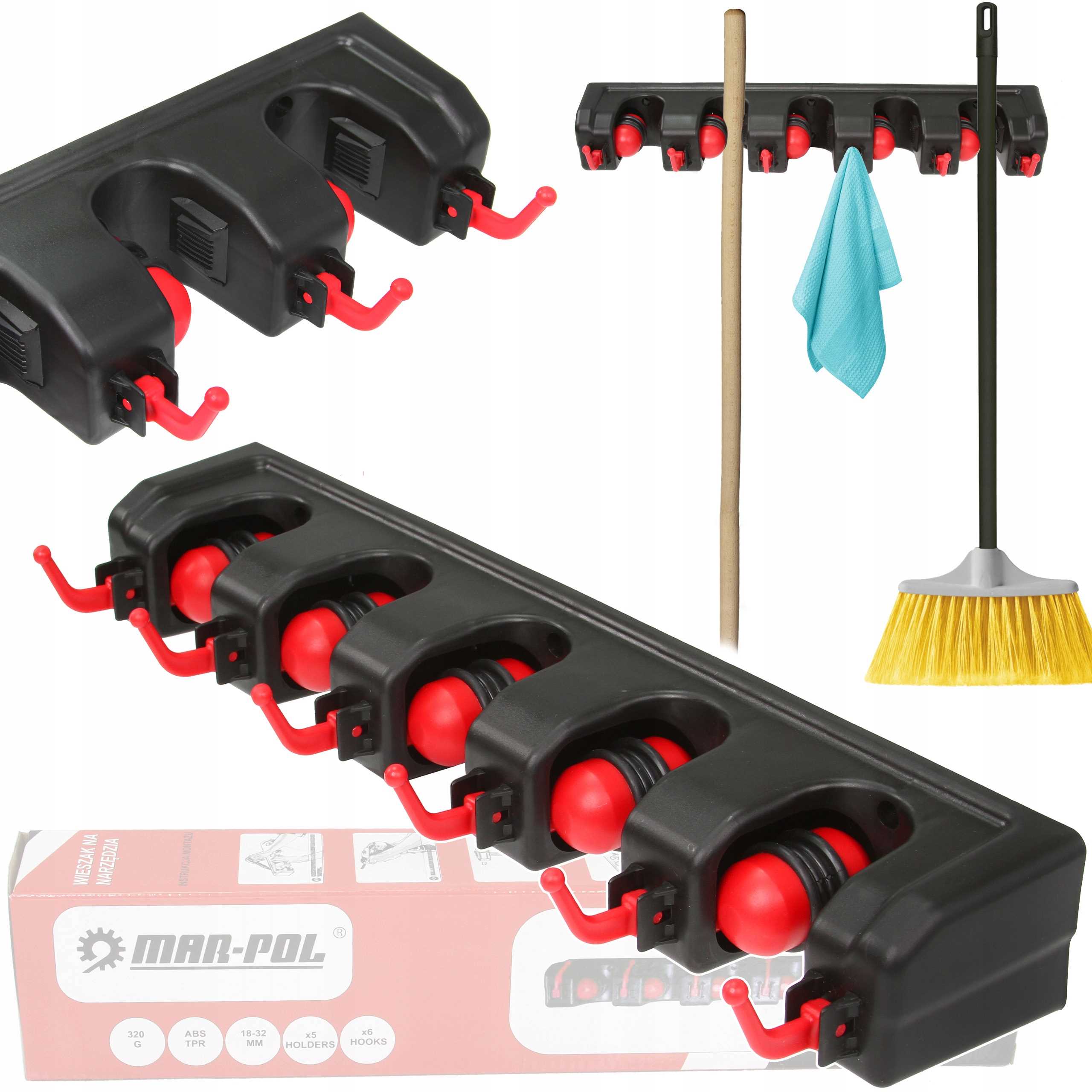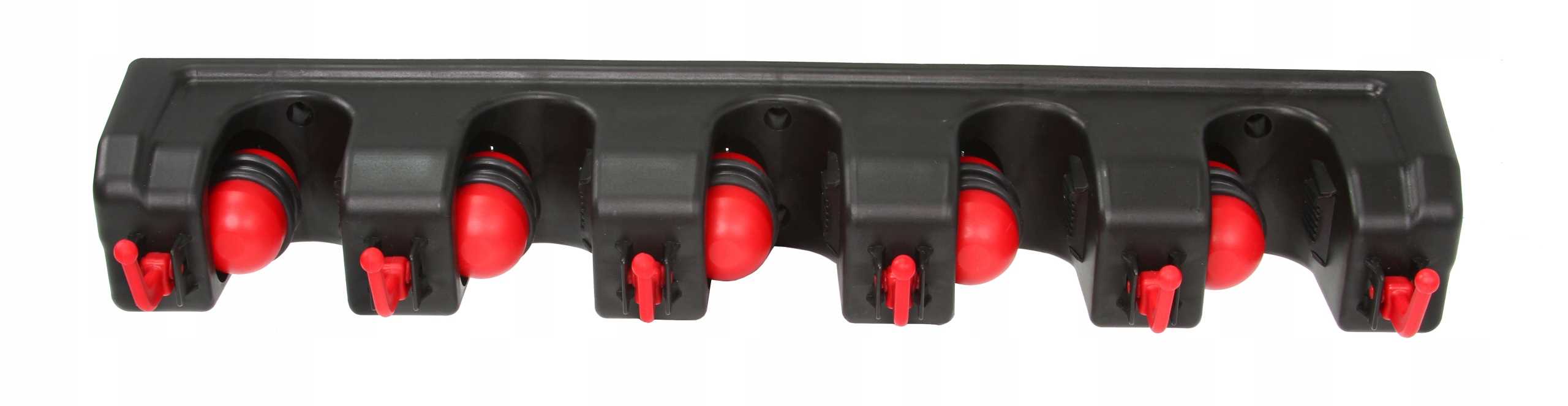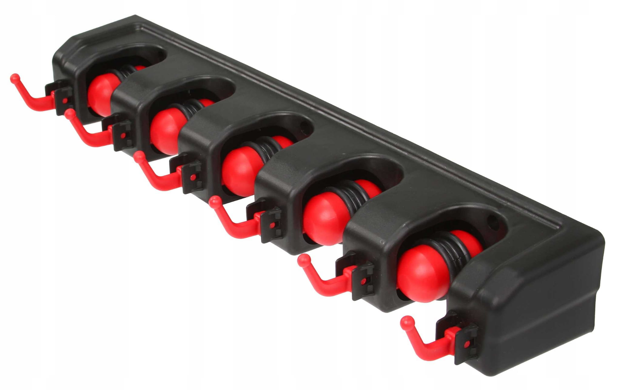 Niezwykle praktyczny garażowy wieszak ścienny na narzędzia ogrodowe. Wyposażony został w aż 5 automatycznych uchwytów, które same dopasowują się do grubości trzonka narzędzia (do maksymalnie 32 mm), dzięki samozaciskowej kulce oraz gumie ze stoperem.