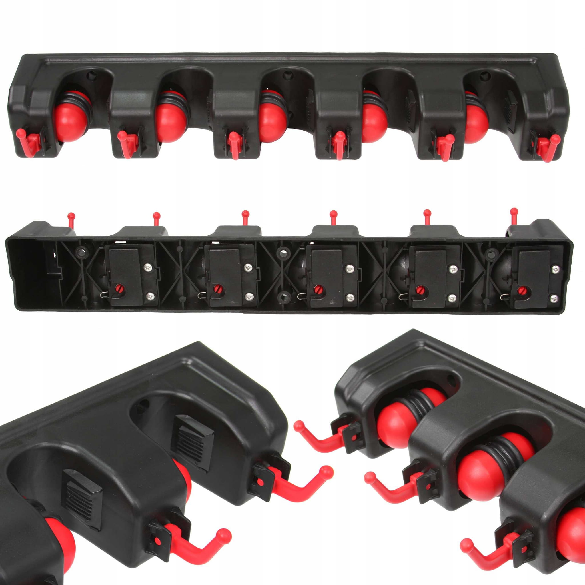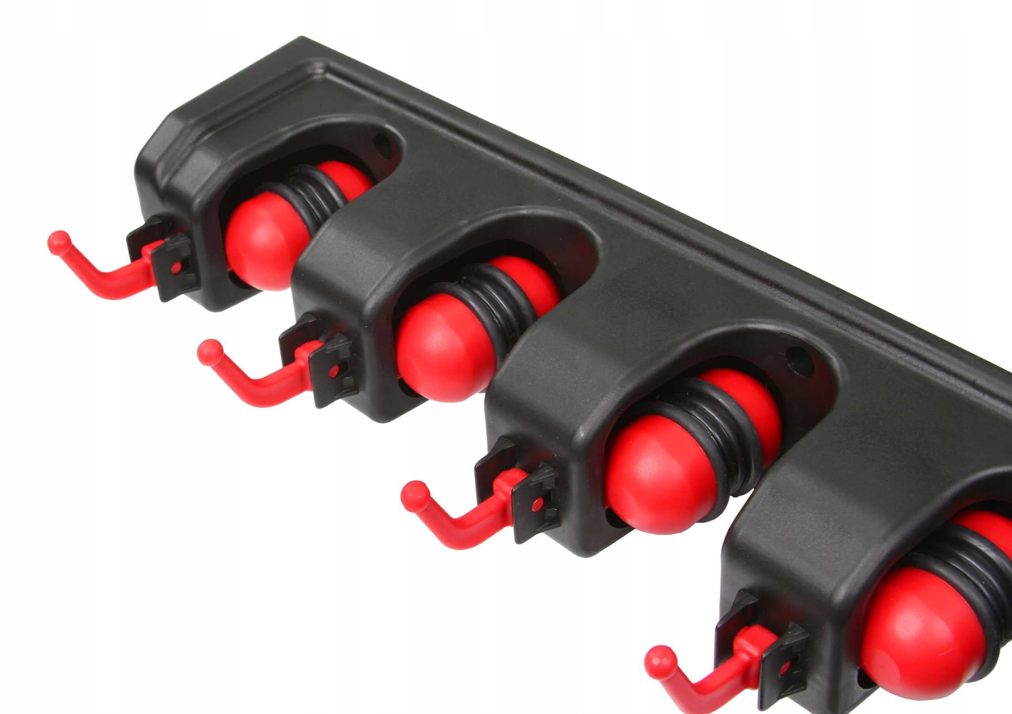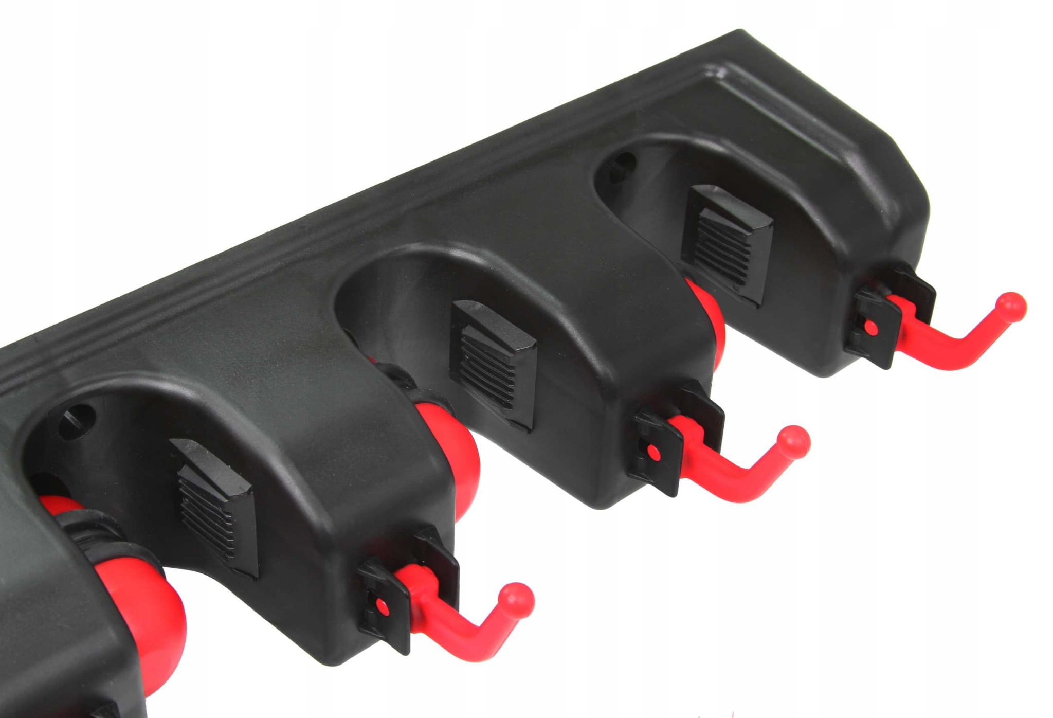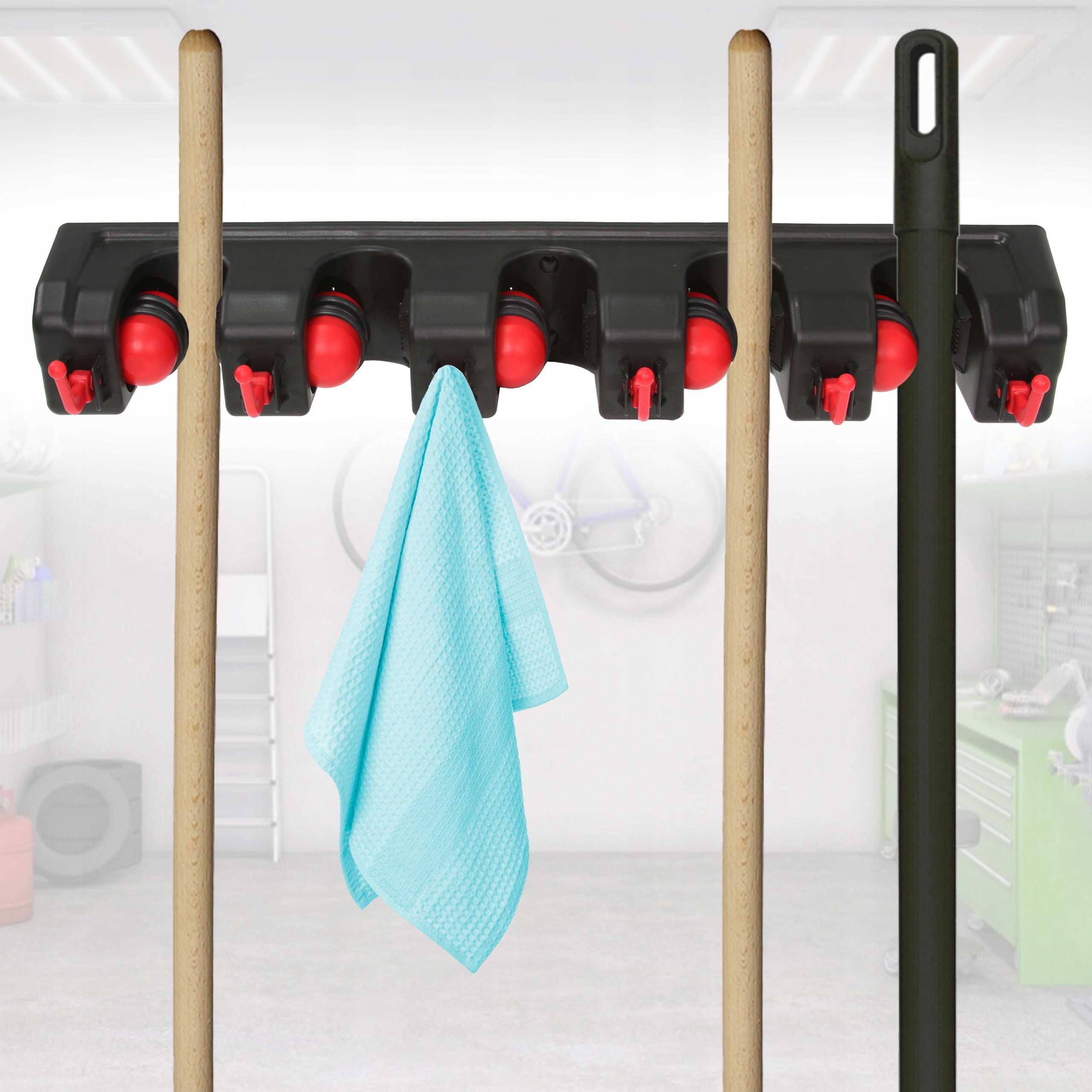 Niezwykle praktyczny garażowy wieszak ścienny na narzędzia ogrodowe. Wyposażony został w aż 5 automatycznych uchwytów, które same dopasowują się do grubości trzonka narzędzia (do maksymalnie 32 mm), dzięki samozaciskowej kulce oraz gumie ze stoperem.
