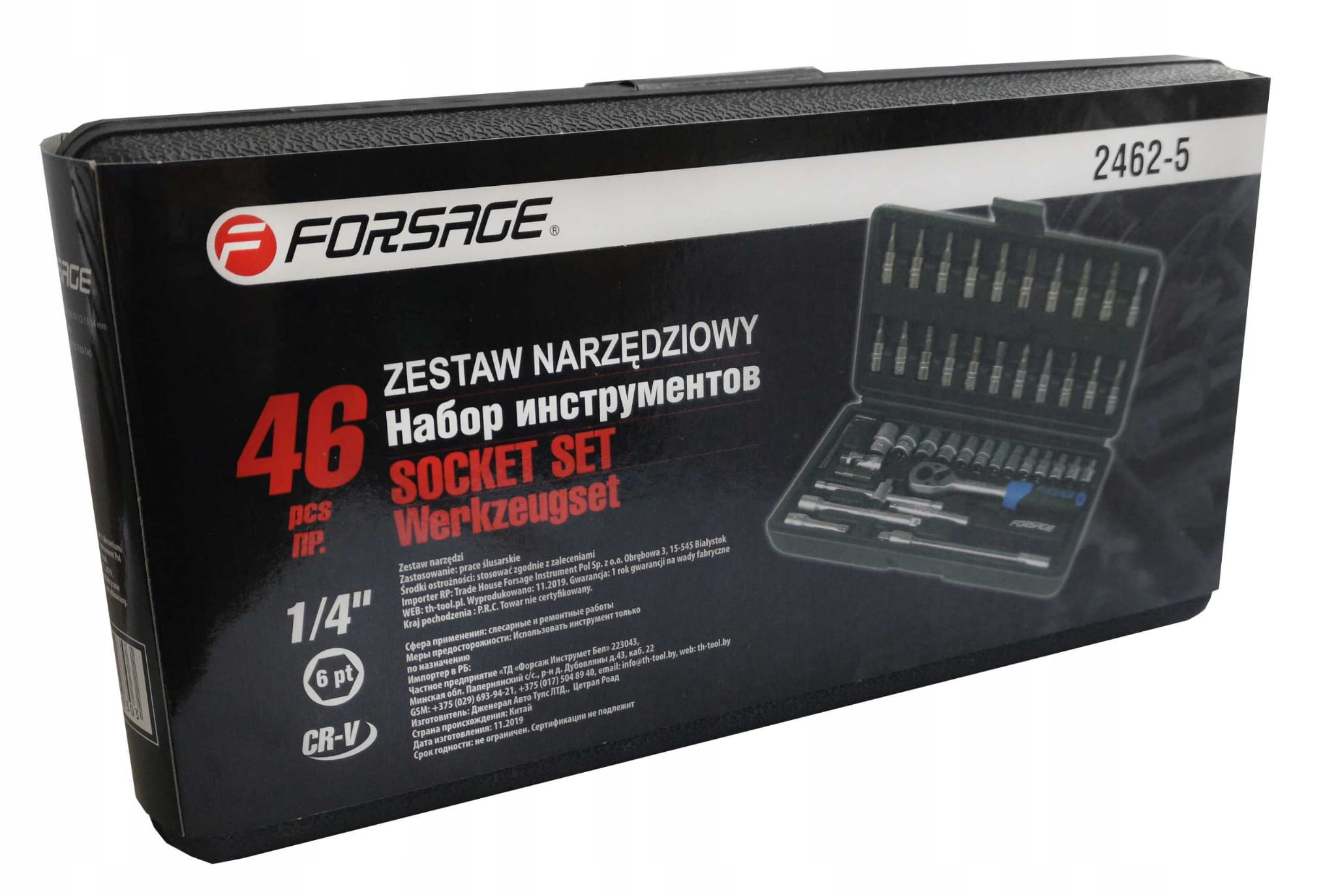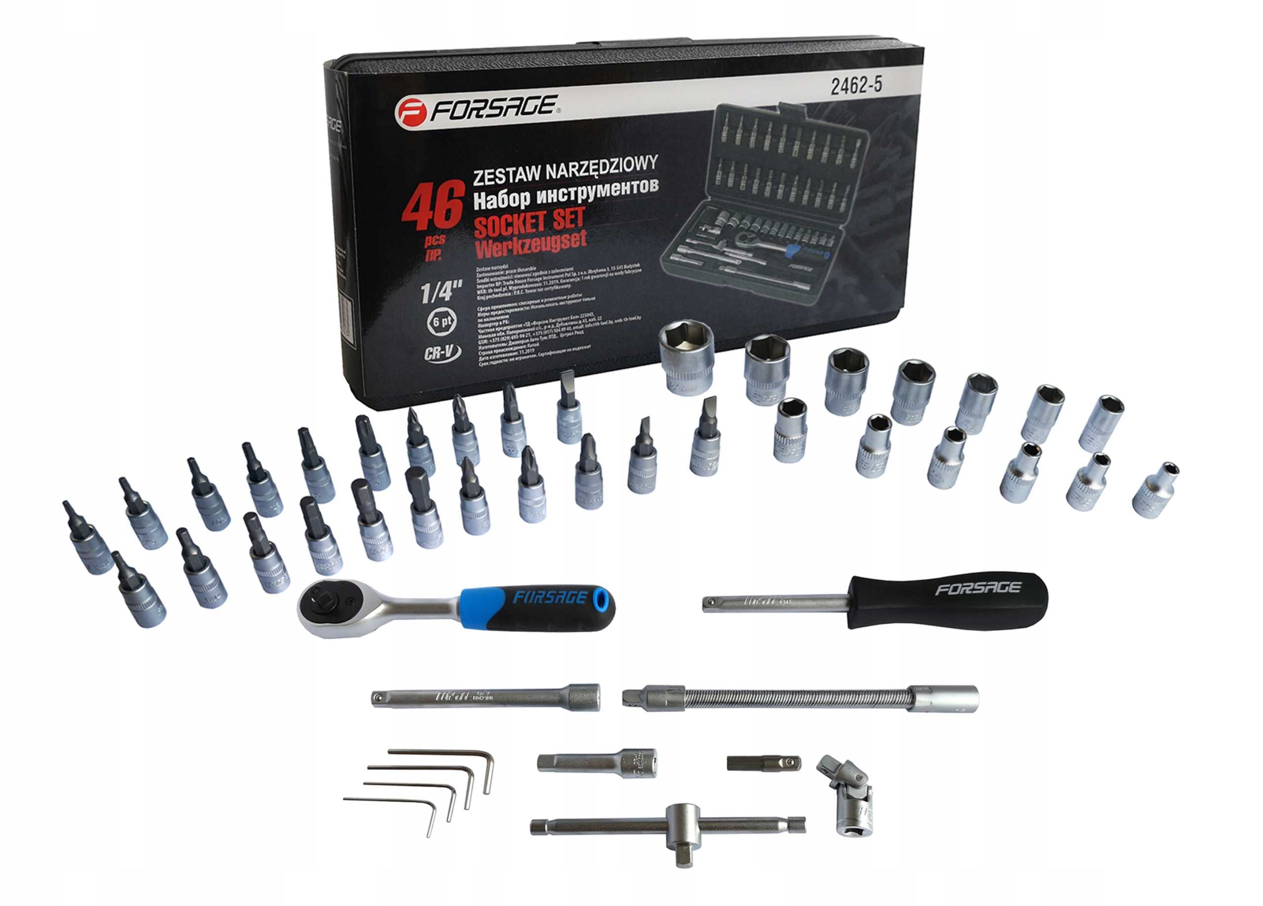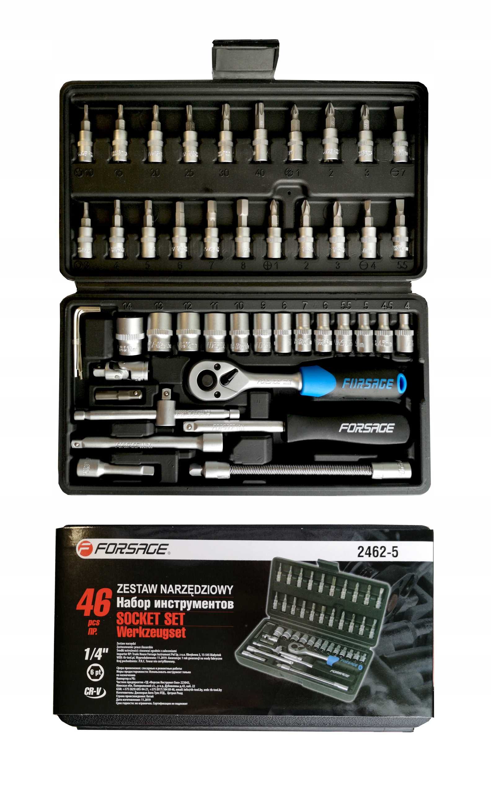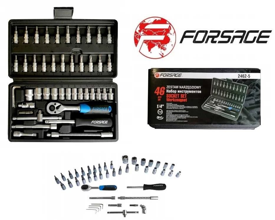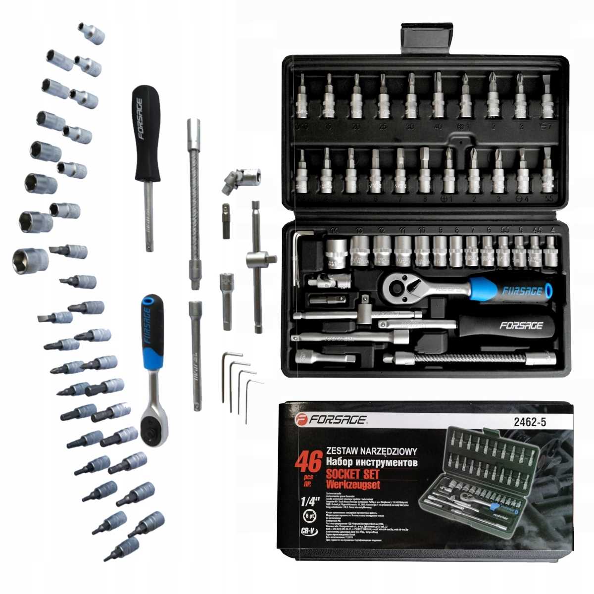 Zestaw kluczy nasadowych 1/4" składa się z 46 elementów, wykonanych z wysokiej jakości stali chromowo-wanadowej.