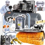 Na wyposażeniu również niezbędne maski, kombinezon, węże , olej do sprężarki .. Agregat dzięki temu że posiada na wyposażeniu 5 różnych lanc (pistoletów) ma bardzo szerokie zastosowanie ! Min. :