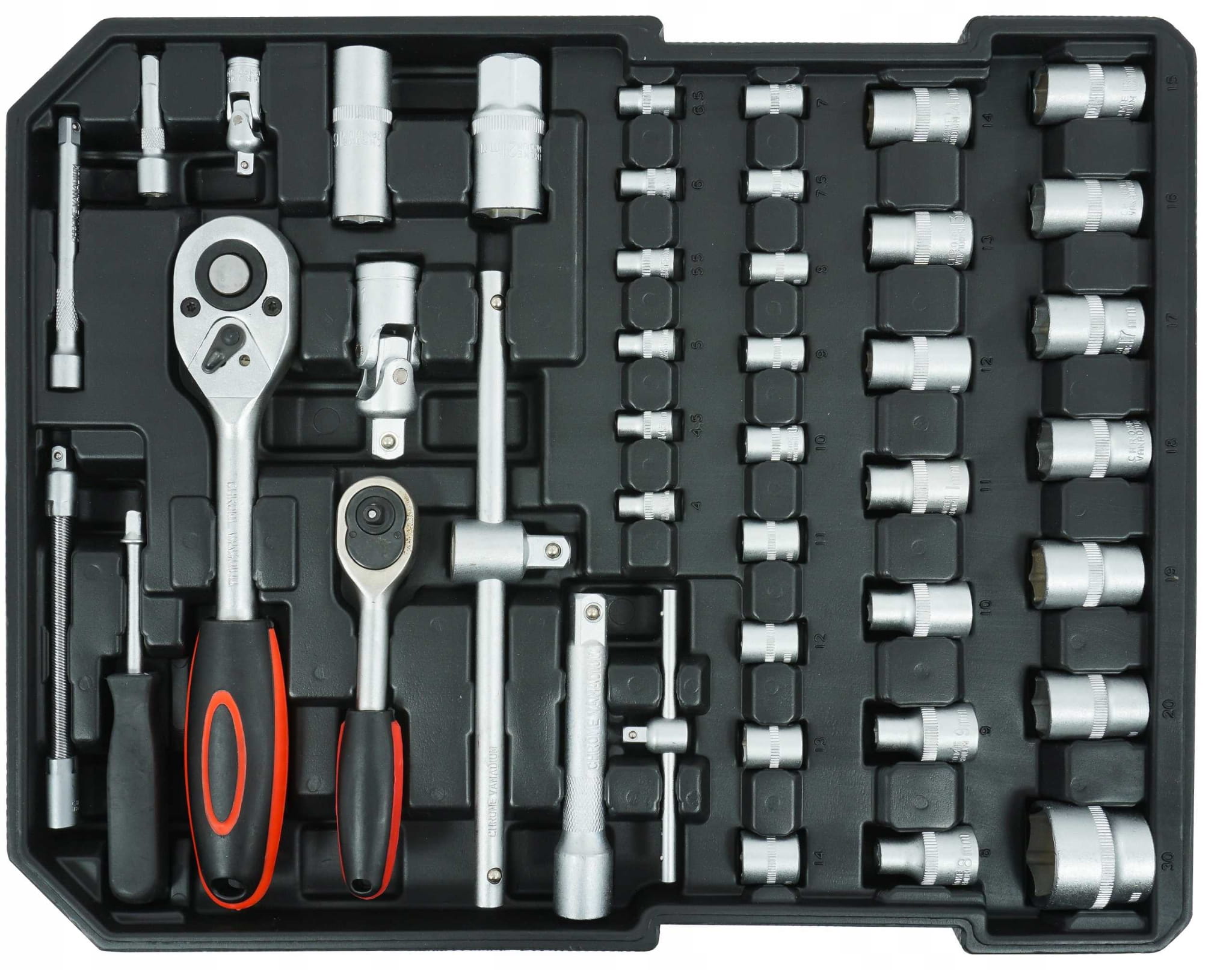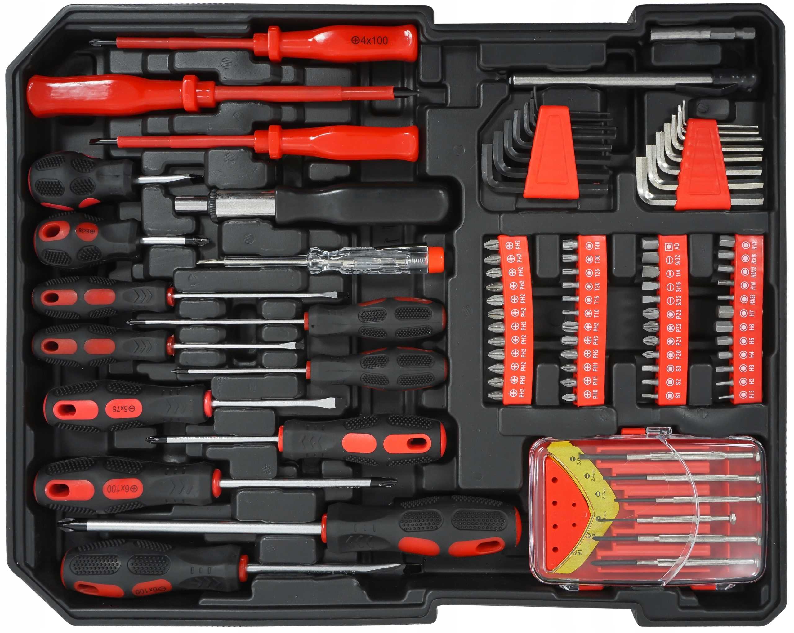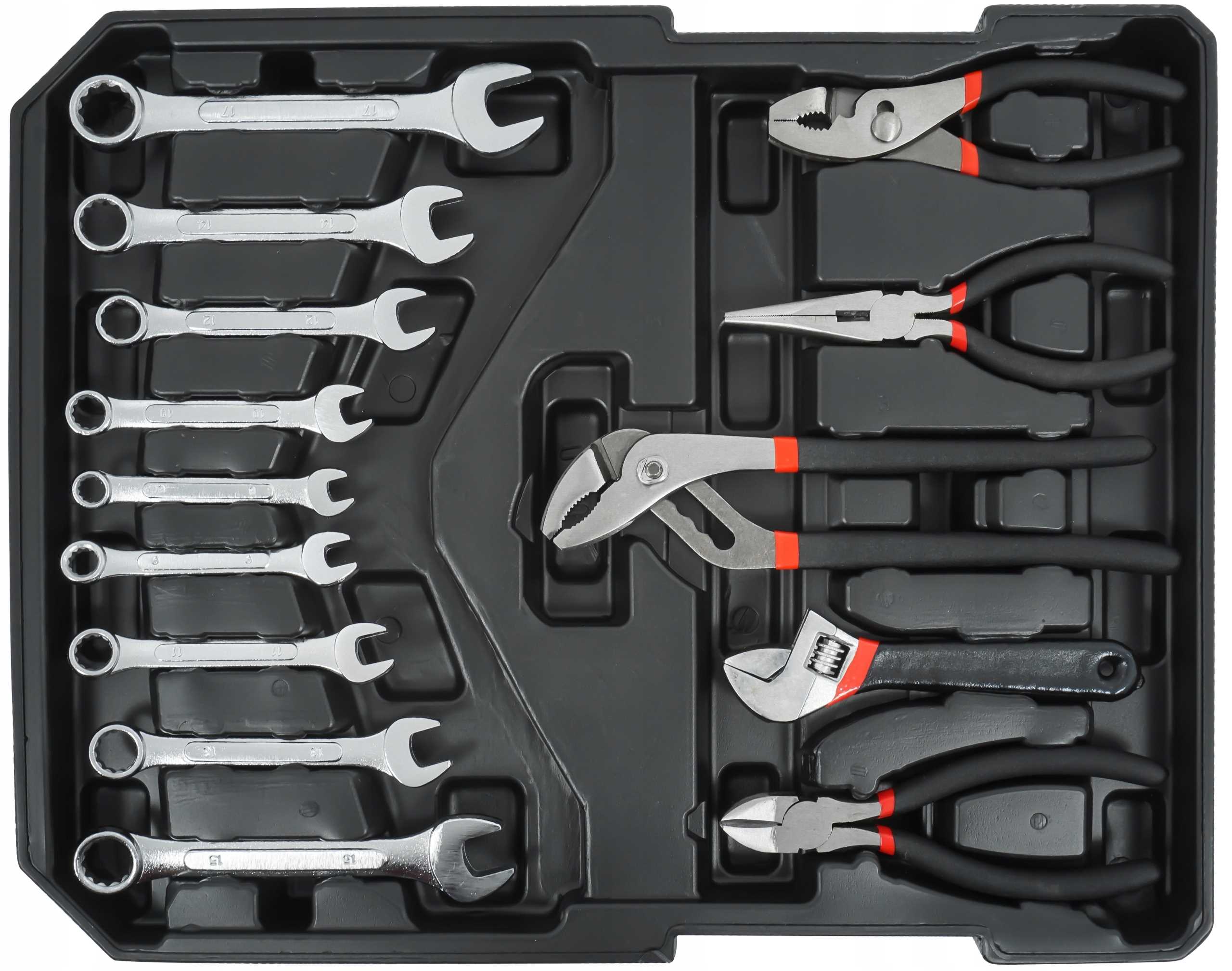 Bardzo praktyczny zestaw najpotrzebniejszych narzędzi. Każde narzędzie ma precyzyjnie określone miejsce i zawsze będzie szybko pod ręką. Całość została doskonale dobrana oraz skompletowana pod względem potrzeb w każdym gospodarstwie domowym oraz majsterkowaniu czy pracach w garażu. Wysokiej jakości stop Cr-V, wysokiej jakości plastik na uchwytach i gumowane strefy antypoślizgowe wszędzie tam, gdzie jest to potrzebne, gwarantują, że narzędzia będą służyły Ci przez wiele lat!