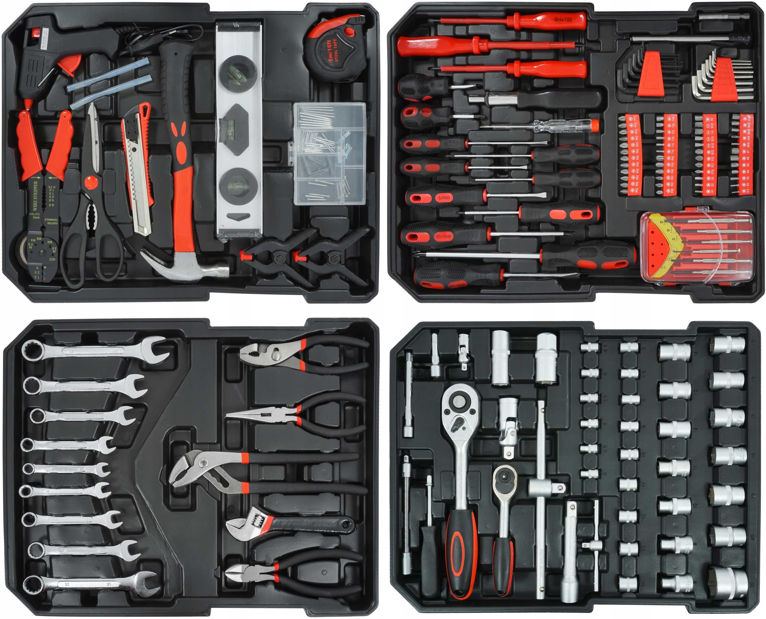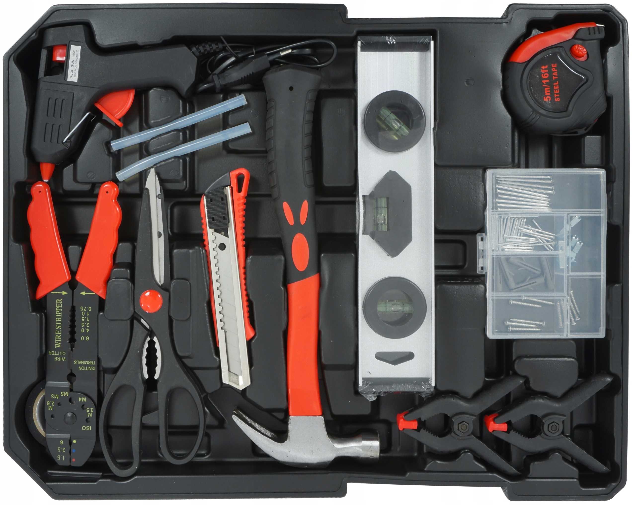 Funkcjonalny zestawy narzędziowy zawierający najbardziej przydatne narzędzia, niezbędne w każdym domu lub warsztacie.