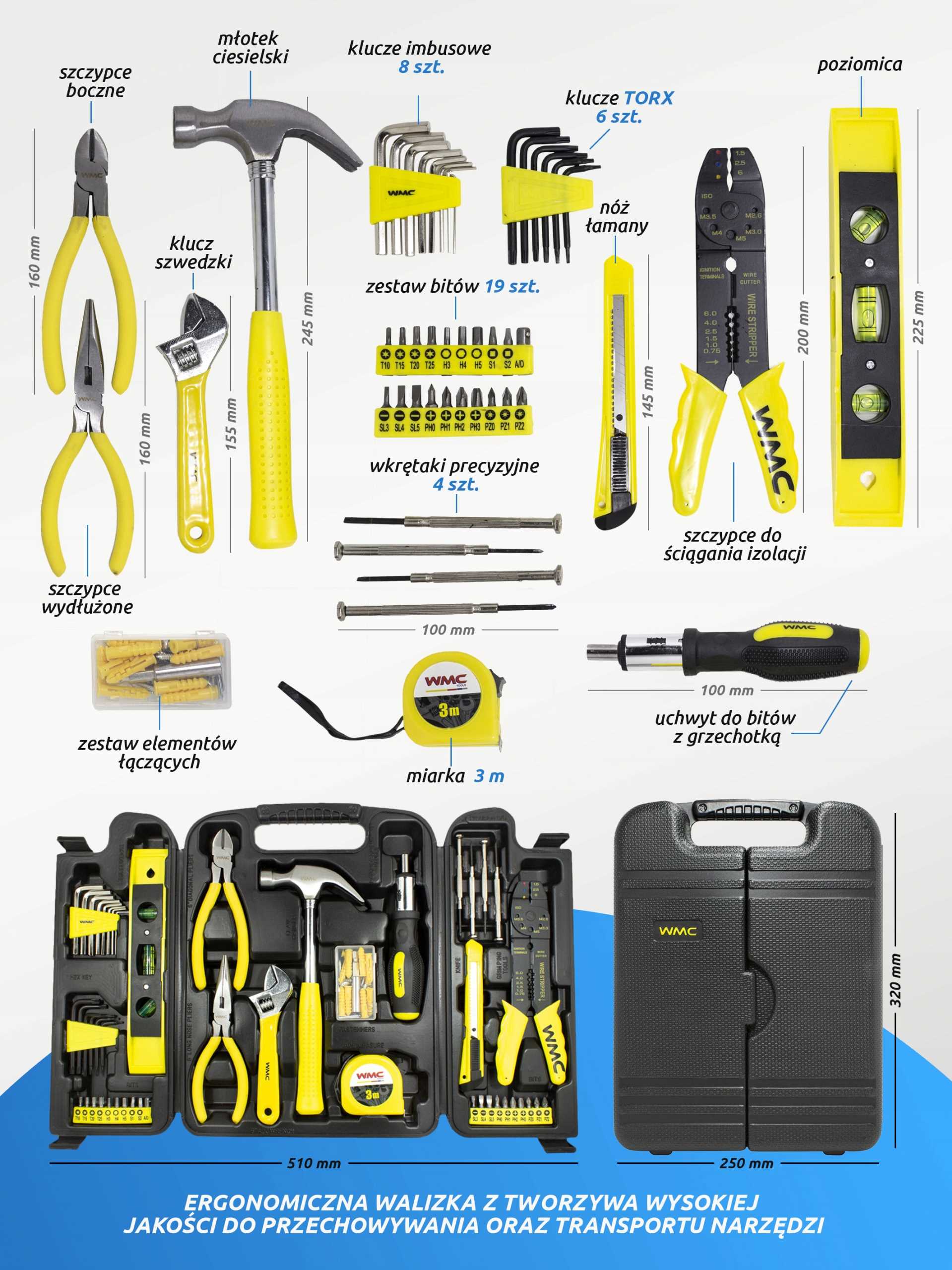 ZESTAW NARZĘDZI WALIZKA NARZĘDZIOWA MŁOTEK SZCZYPCE WKRĘTAKI WMC 130 el