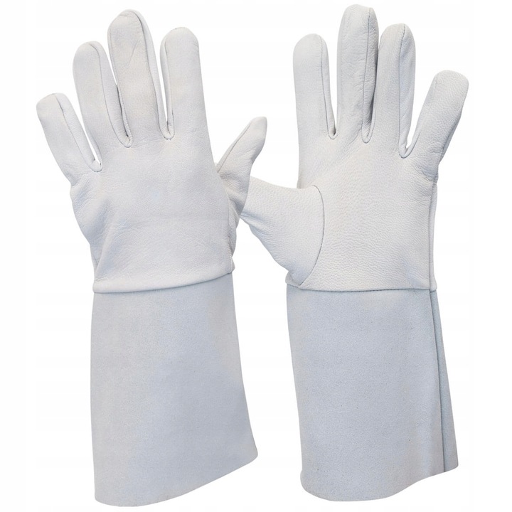 Rękawice typu spawalnicze z delikatnej, bardzo miękkiej skóry licowej, w naturalnym kolorze- białym.