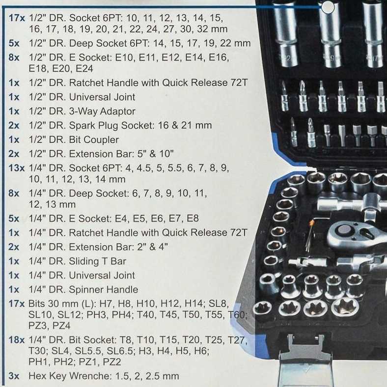 Wielofunkcyjność. Zestaw 108 elementów zawierający nasadki o różnych rozmiarach, nasadki do świec zapłonowych, nasadki bitowe, przedłużki, przeguby uniwersalne i klucze sześciokątne. Pozwala to poradzić sobie z szerokim zakresem zadań - od konserwacji samochodu po montaż mebli.