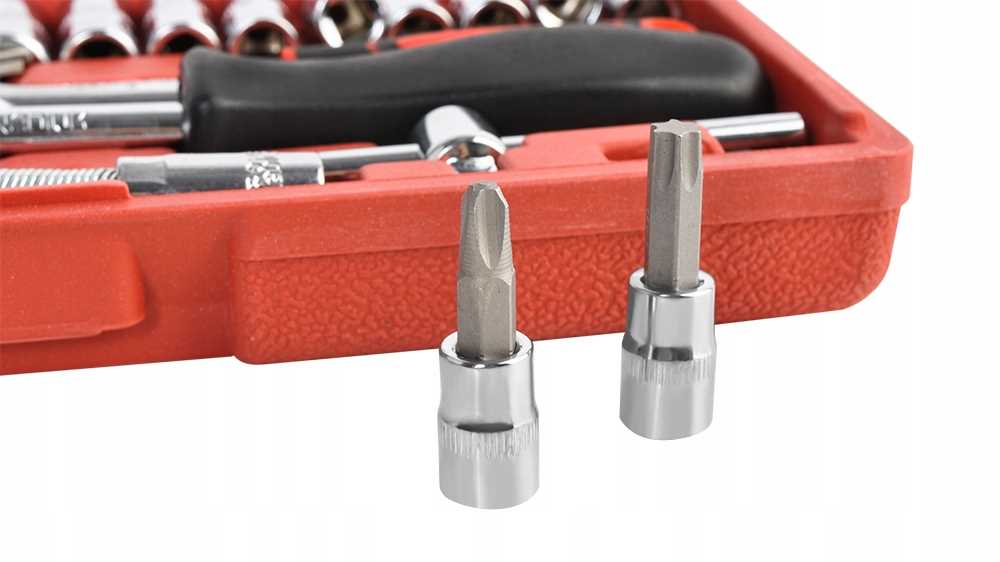 Zestaw zawiera 13 nasadek (14mm; 13mm; 12mm; 11mm; 10mm; 9mm; 8mm; 7mm; 6mm; 5.5mm; 5mm; 4.5mm; 4mm); 6 końcówek wkrętakowych TORX (T10; T15; T20; T25; T30; T40); 6 końcówek wkrętakowych sześciokątnych HEX (3mm; 4mm; 5mm; 6mm; 7mm; 8mm); 3 końcówki wkrętakowe krzyżowe (Ph1; Ph2; Ph3); 3 końcówki wkrętakowe krzyżowe (Pz1; Pz2; Pz3); 3 końcówki wkrętakowe płaskie (4mm; 5.5mm; 7mm); 3 klucze imbusowe (1,5mm; 2.0mm; 2.5mm); 2 przedłużki 1/4' (50; 100mm); grzechotkę 1/4'' (150mm, 72T); pokrętło wkrętakowe 1/4'', 150mm; pokrętło przesuwne 1/4'', 115mm; przedłużka elastyczna 1/4'', 145mm; adapter do końcówek; przegub Cardana oraz etui.